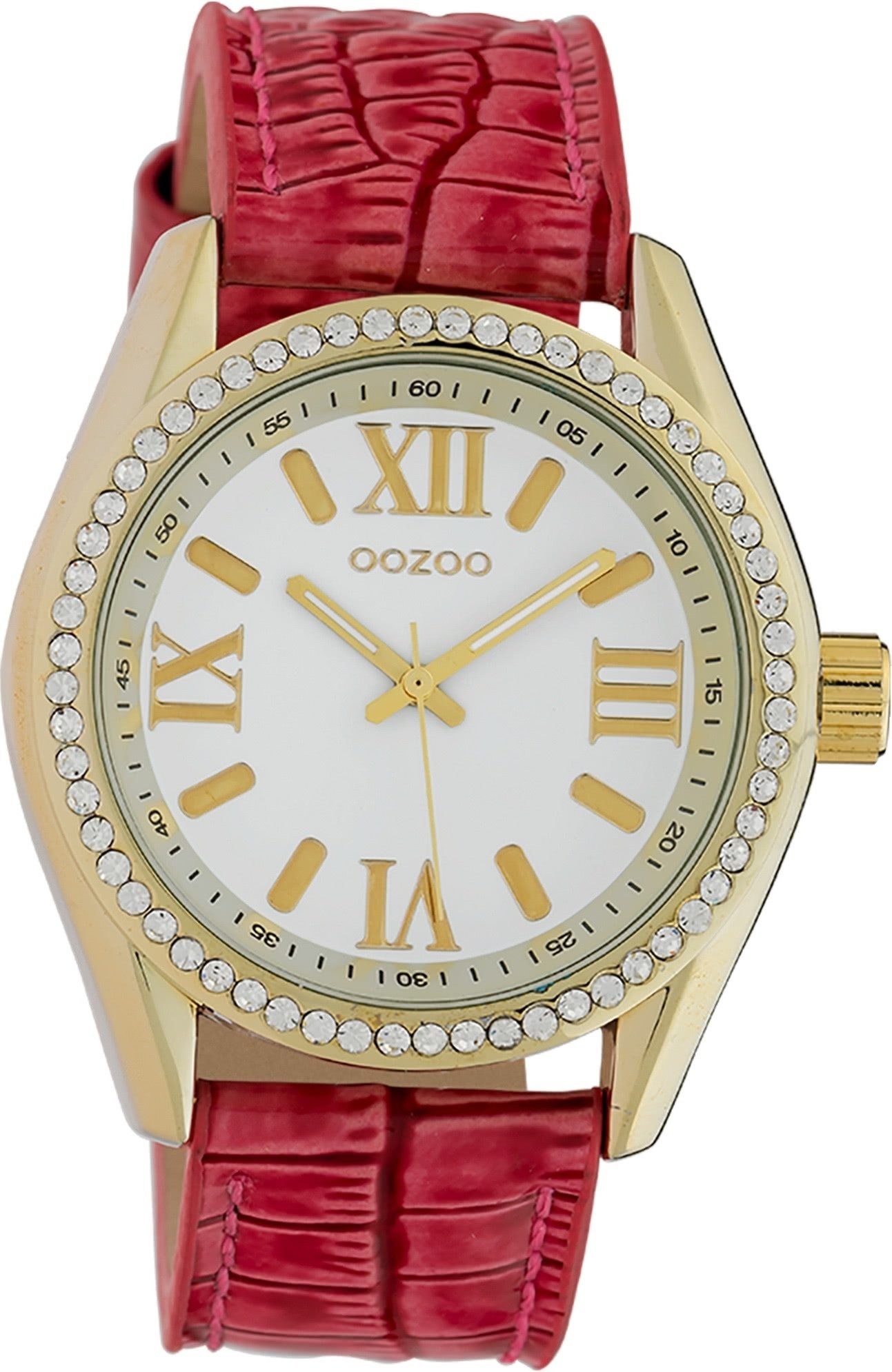 Die Fashion Uhr der Marke Oozoo hat ein schönes Armband aus Leder in pink mit Dornschließe. Eine Uhr aus der Oozoo Timepieces Kollektion für Damen in der Gehäusefarbe gold mit Quarzwerk. Die Analoguhr mit Mineralglas hat ein Zifferblatt in der Farbe weiß. Die Form der Uhr ist rund und das Gehäuse ist groß ca. 40mm.