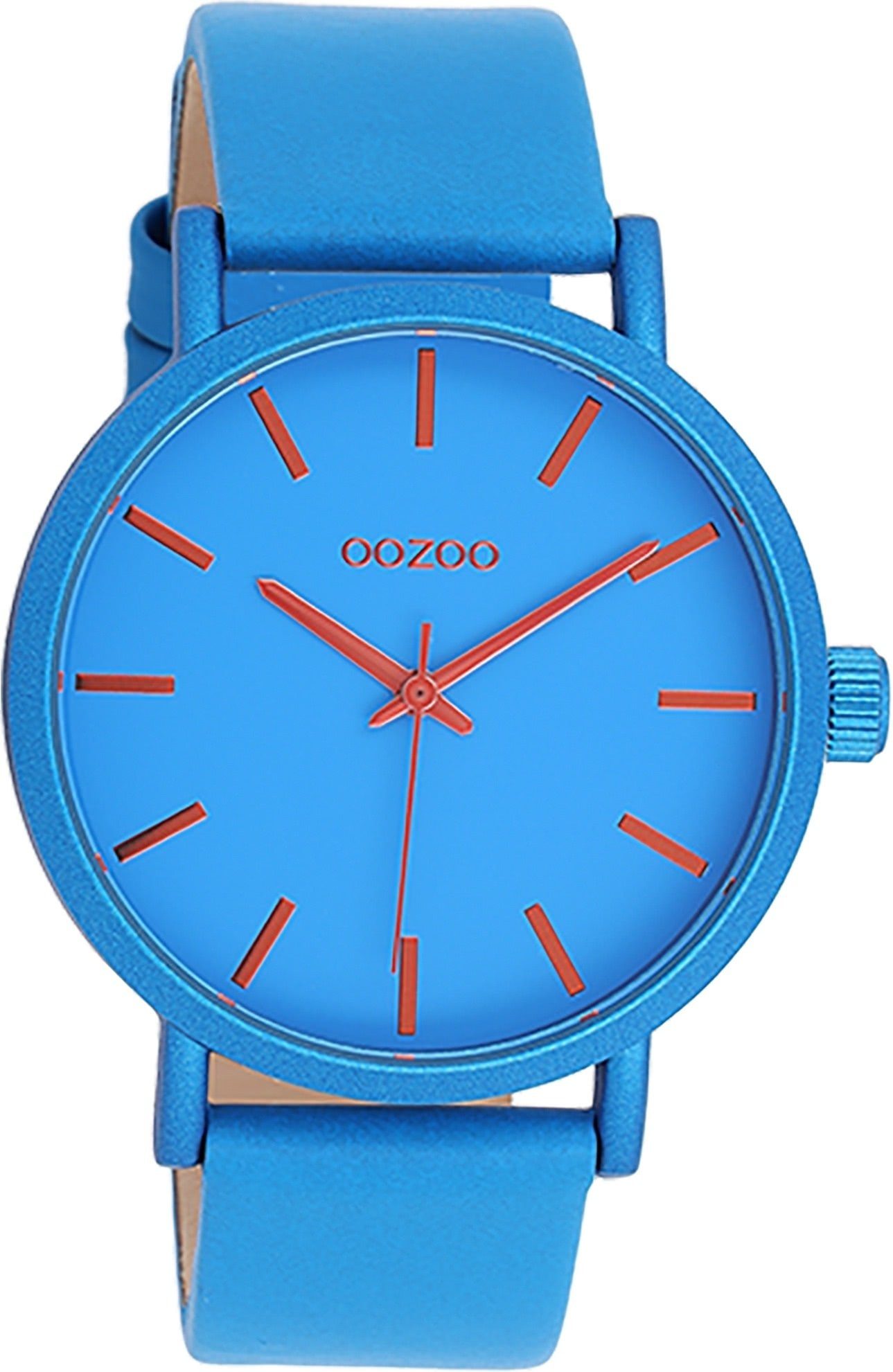Die Fashion Uhr der Marke Oozoo hat ein schönes Armband aus Leder in blau mit Dornschließe. Eine Uhr aus der Oozoo Timepieces Kollektion für Damen in der Gehäusefarbe blau mit Quarzwerk. Die Analoguhr mit Mineralglas hat ein Zifferblatt in der Farbe blau. Die Form der Uhr ist rund und das Gehäuse ist groß ca. 42mm.