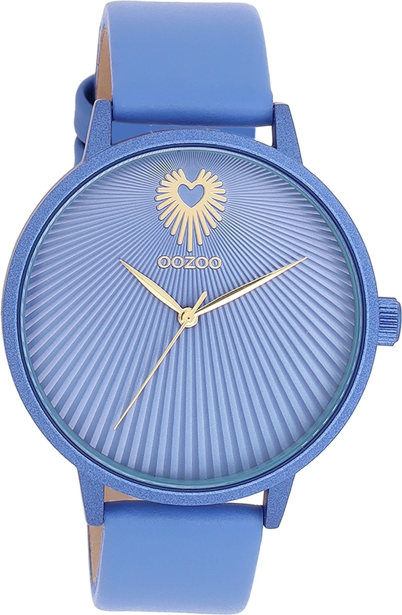 Die Fashion Uhr der Marke Oozoo hat ein schönes Armband aus Leder in blau mit Dornschließe. Eine Uhr aus der Oozoo Timepieces Kollektion für Damen in der Gehäusefarbe blau mit Quarzwerk. Die Analoguhr mit Mineralglas hat ein Zifferblatt in der Farbe blau. Die Form der Uhr ist rund und das Gehäuse ist groß ca. 42mm.