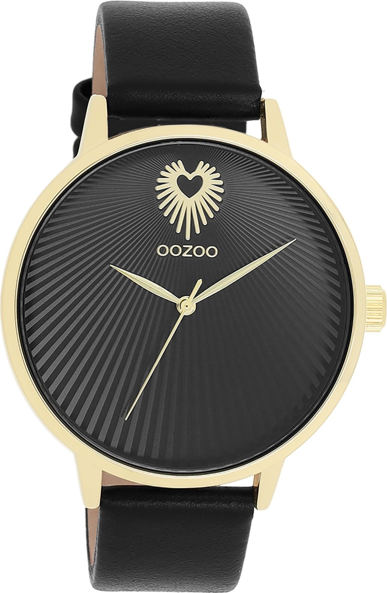 Die Fashion Uhr der Marke Oozoo hat ein schönes Armband aus Leder in schwarz mit Dornschließe. Eine Uhr aus der Oozoo Timepieces Kollektion für Damen in der Gehäusefarbe gold mit Quarzwerk. Die Analoguhr mit Mineralglas hat ein Zifferblatt in der Farbe schwarz. Die Form der Uhr ist rund und das Gehäuse ist groß ca. 42mm.