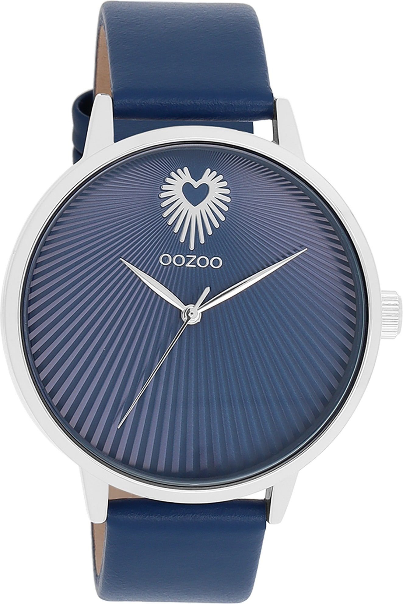 Die Fashion Uhr der Marke Oozoo hat ein schönes Armband aus Leder in blau mit Dornschließe. Eine Uhr aus der Oozoo Timepieces Kollektion für Damen in der Gehäusefarbe silber mit Quarzwerk. Die Analoguhr mit Mineralglas hat ein Zifferblatt in der Farbe blau. Die Form der Uhr ist rund und das Gehäuse ist groß ca. 42mm.