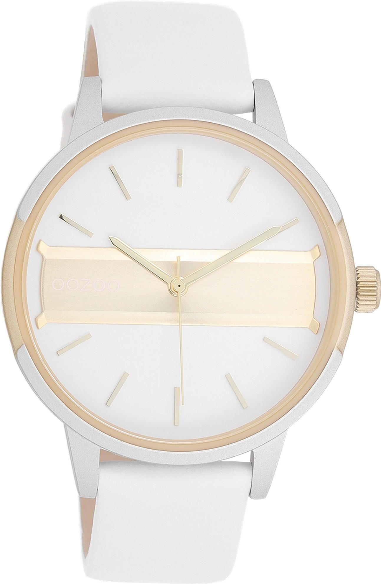 Die Fashion Uhr der Marke Oozoo hat ein schönes Armband aus Leder in weiß mit Dornschließe. Eine Uhr aus der Oozoo Timepieces Kollektion für Damen in der Gehäusefarbe silber,gold mit Quarzwerk. Die Analoguhr mit Mineralglas hat ein Zifferblatt in der Farbe weiß,gold. Die Form der Uhr ist rund und das Gehäuse ist groß ca. 42mm.