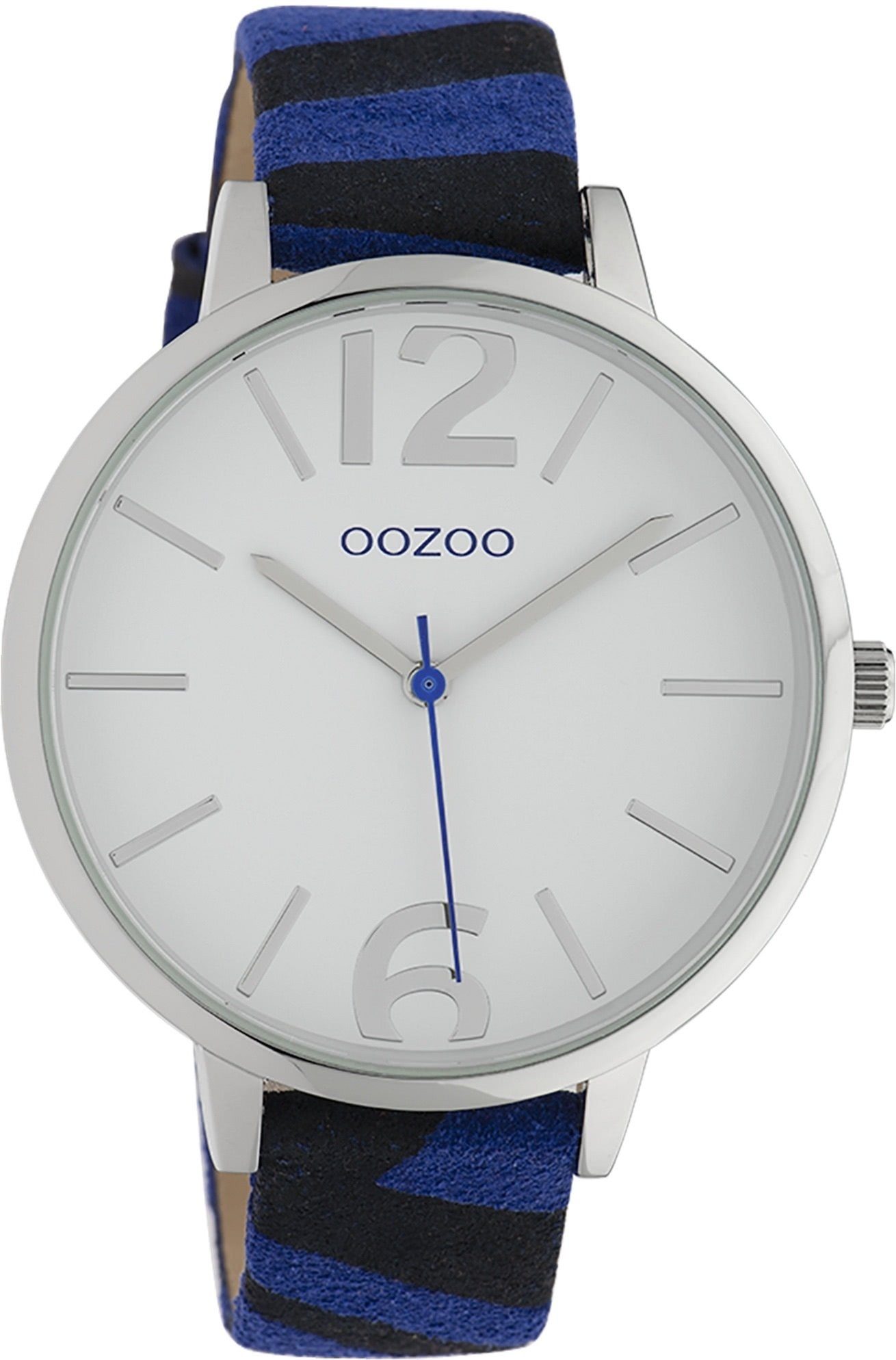Die Fashion Uhr der Marke Oozoo hat ein schönes Armband aus Leder in blau schwarz mit Dornschließe. Eine Uhr aus der Oozoo Timepieces Kollektion für Damen in der Gehäusefarbe silber mit Quarzwerk. Die Analoguhr mit Mineralglas hat ein Zifferblatt in der Farbe weiß. Die Form der Uhr ist rund und das Gehäuse ist groß ca. 43mm.