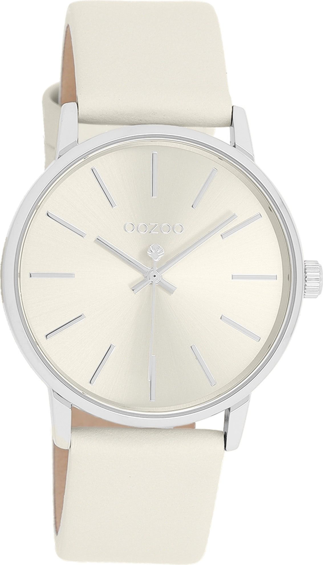 Die Fashion Uhr der Marke Oozoo hat ein schönes Armband aus Leder in beige mit Dornschließe. Eine Uhr aus der Oozoo Timepieces Kollektion für Damen in der Gehäusefarbe silber mit Quarzwerk. Die Analoguhr mit Mineralglas hat ein Zifferblatt in der Farbe beige. Die Form der Uhr ist rund und das Gehäuse ist mittel ca. 36mm.