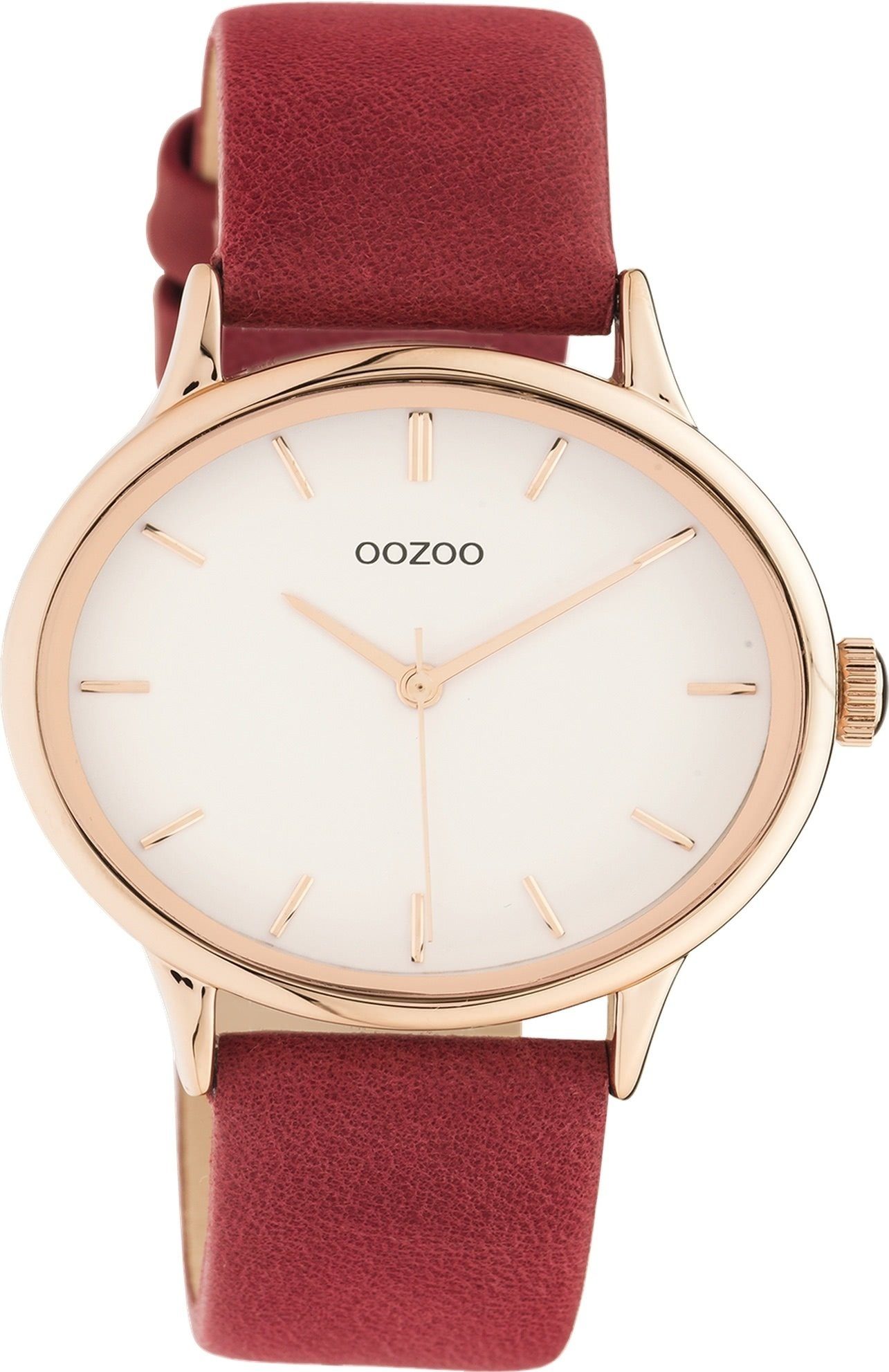 Die Fashion Uhr der Marke Oozoo hat ein schönes Armband aus Leder in rot mit Dornschließe. Eine Uhr aus der Oozoo Timepieces Kollektion für Damen in der Gehäusefarbe rosegold mit Quarzwerk. Die Analoguhr mit Mineralglas hat ein Zifferblatt in der Farbe weiß. Die Form der Uhr ist rund und das Gehäuse ist groß ca. 42mm.