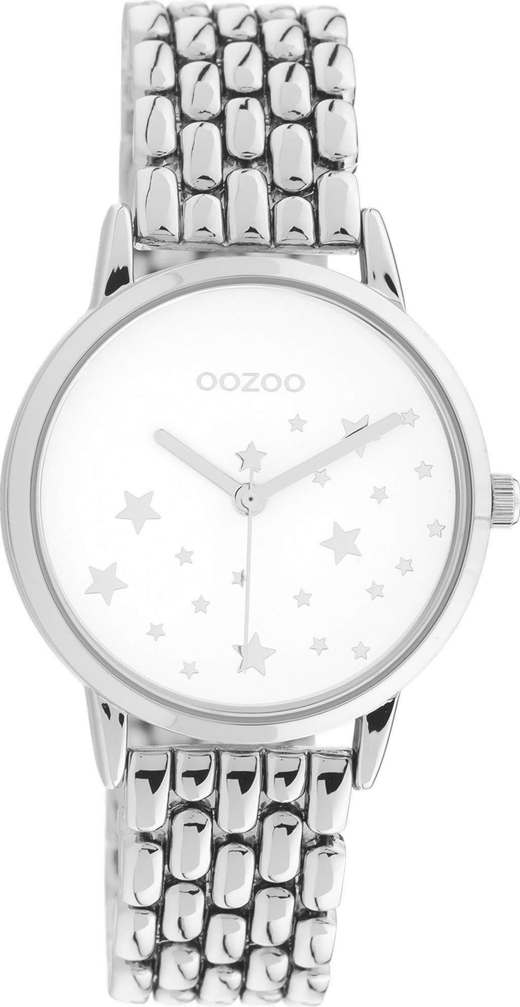Die Elegant Uhr der Marke Oozoo hat ein schönes Armband aus Edelstahl in silber mit Schiebeverschluss. Eine Uhr aus der Oozoo Timepieces Kollektion für Damen in der Gehäusefarbe silber mit Quarzwerk. Die Analoguhr mit Mineralglas hat ein Zifferblatt in der Farbe weiß. Die Form der Uhr ist rund und das Gehäuse ist mittel ca. 34mm.