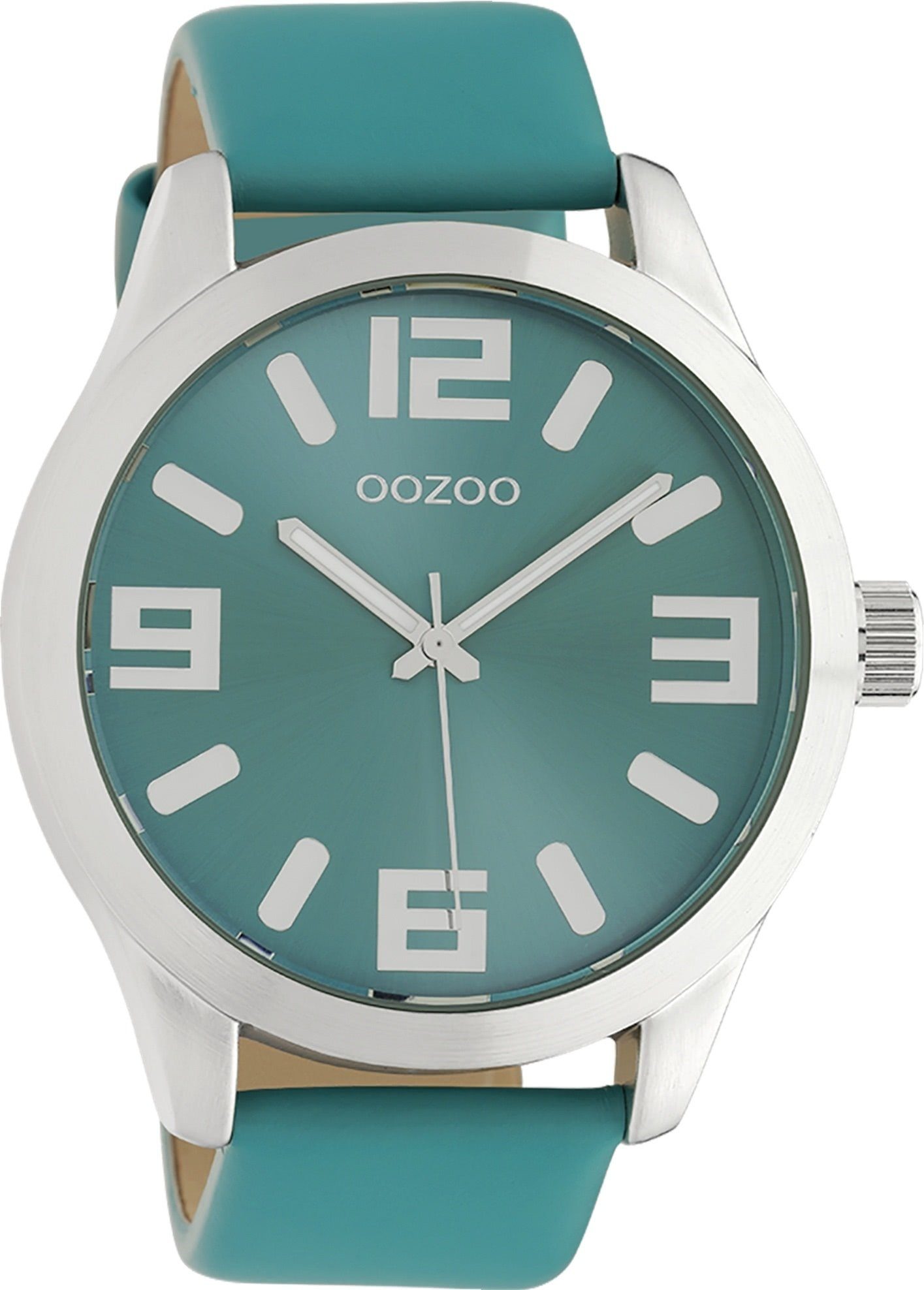 Diese Fashion Uhr der Marke Oozoo hat ein hochwertiges Armband aus Leder, in türkis, mit Dornschließe. Die Uhr aus der Oozoo Timepieces Kollektion für Damen besitzt ein silbernes Gehäuse mit Quarzwerk. Die Analoguhr mit Mineralglas hat ein Ziffernblatt in der Farbe türkis und ein rundes, ca. 47mm großes Gehäuse, in silber.