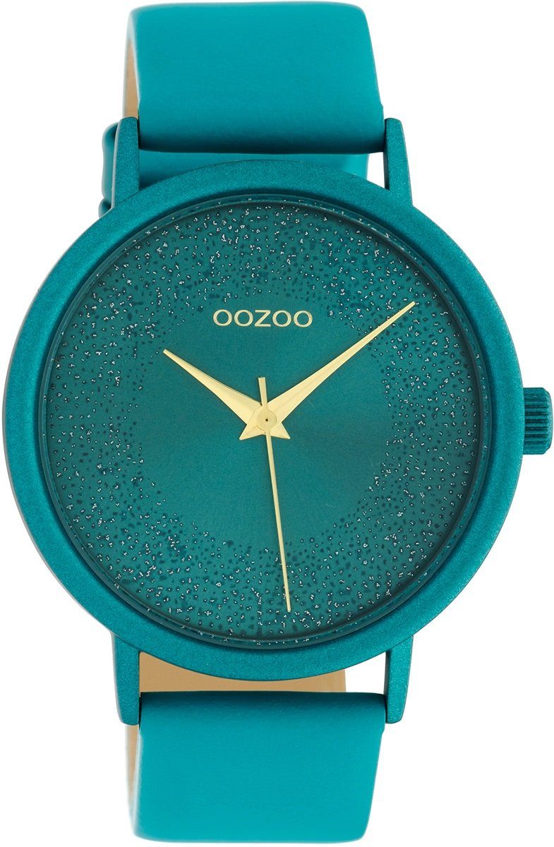 Die Fashion Uhr der Marke Oozoo hat ein schönes Armband aus Leder in türkis mit Dornschließe. Eine Uhr aus der Oozoo Timepieces Kollektion für Damen in der Gehäusefarbe türkis mit Quarzwerk. Die Analoguhr mit Mineralglas hat ein Zifferblatt in der Farbe türkis. Die Form der Uhr ist rund und das Gehäuse ist groß ca. 42mm.