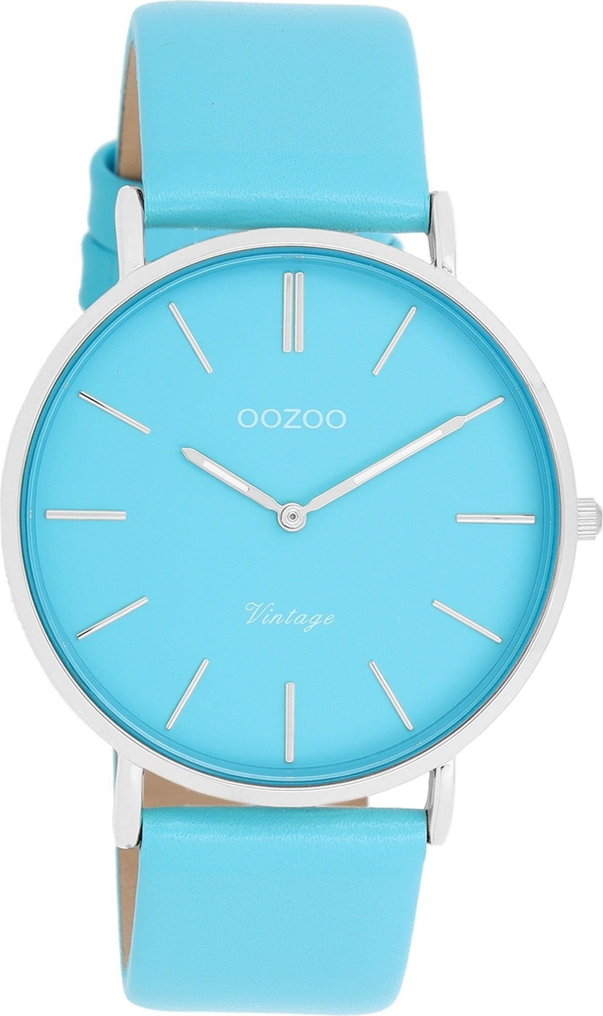 Die Fashion Uhr der Marke Oozoo hat ein schönes Armband aus Leder in blau mit Dornschließe. Eine Uhr aus der Oozoo Vintage Series Kollektion für Damen in der Gehäusefarbe silber mit Quarzwerk. Die Analoguhr mit Mineralglas hat ein Zifferblatt in der Farbe blau. Die Form der Uhr ist rund und das Gehäuse ist groß ca. 40mm.