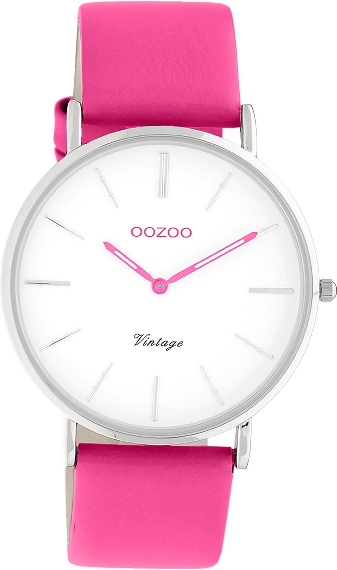 Die Fashion Uhr der Marke Oozoo hat ein schönes Armband aus Leder in pink mit Dornschließe. Eine Uhr aus der Oozoo Vintage Series Kollektion für Damen in der Gehäusefarbe silber mit Quarzwerk. Die Analoguhr mit Mineralglas hat ein Zifferblatt in der Farbe weiß. Die Form der Uhr ist rund und das Gehäuse ist groß ca. 40mm.