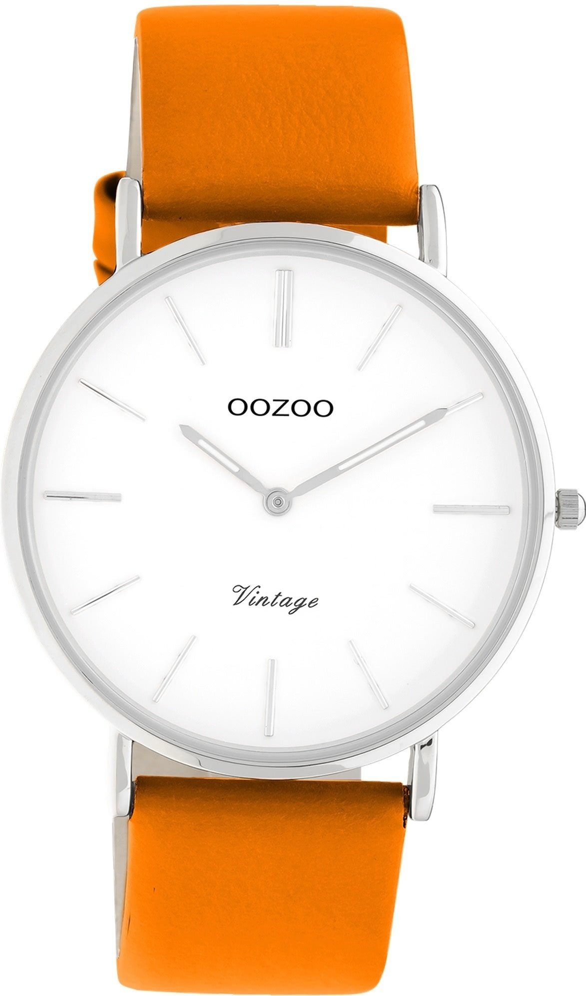 Die Fashion Uhr der Marke Oozoo hat ein schönes Armband aus Leder in orange mit Dornschließe. Eine Uhr aus der Oozoo Vintage Series Kollektion für Damen in der Gehäusefarbe silber mit Quarzwerk. Die Analoguhr mit Mineralglas hat ein Zifferblatt in der Farbe weiß. Die Form der Uhr ist rund und das Gehäuse ist groß ca. 40mm.