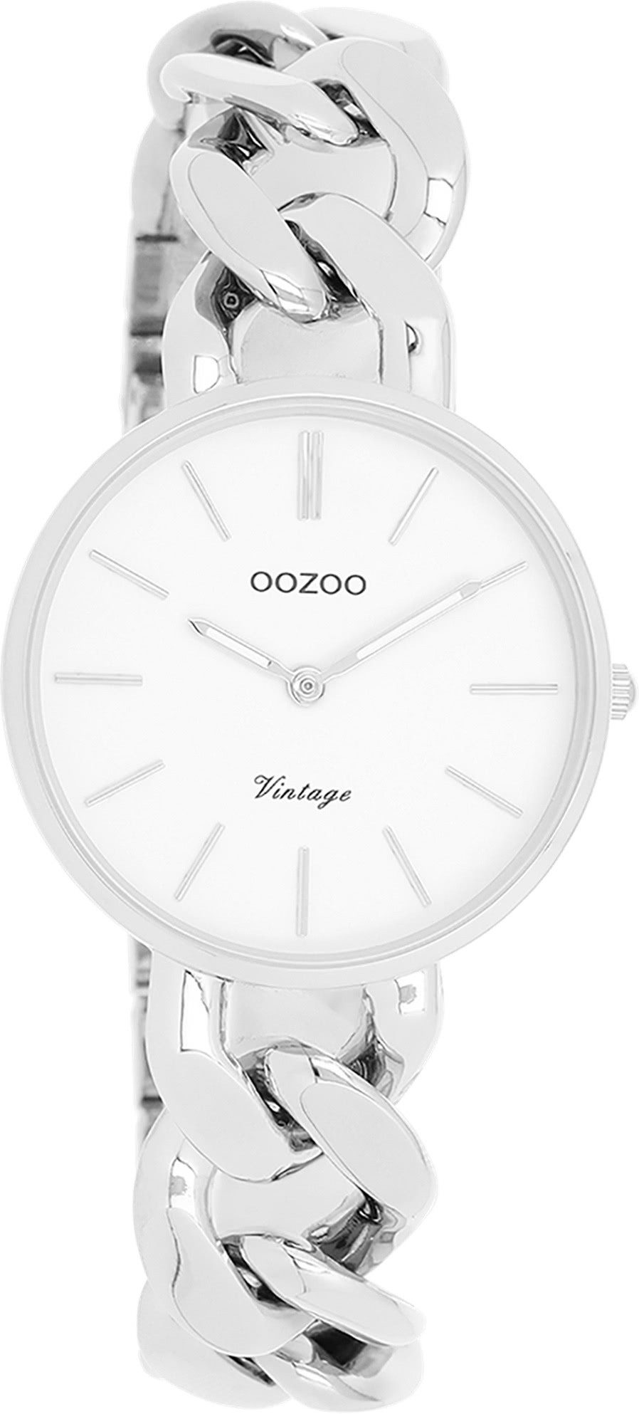 Die Fashion Uhr der Marke Oozoo hat ein schönes Armband aus Metall in silber mit Schiebeverschluss. Eine Uhr aus der Oozoo Vintage Series Kollektion für Damen in der Gehäusefarbe silber mit Quarzwerk. Die Analoguhr mit Mineralglas hat ein Zifferblatt in der Farbe weiß. Die Form der Uhr ist rund und das Gehäuse ist mittel ca. 32mm.