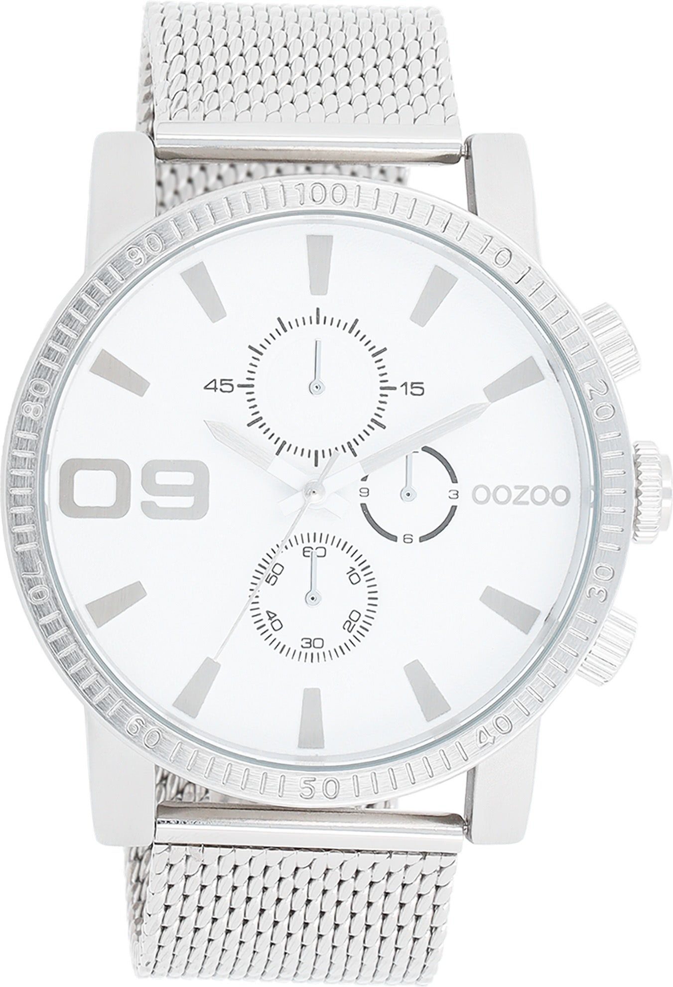 Die Fashion Uhr der Marke Oozoo hat ein schönes Armband aus Metall in silber mit Schiebeverschluss. Eine Uhr aus der Oozoo Timepieces Kollektion für Herren in der Gehäusefarbe silber mit Quarzwerk. Die Analoguhr mit Mineralglas hat ein Zifferblatt in der Farbe weiß. Die Form der Uhr ist rund und das Gehäuse ist extra groß ca. 48mm.