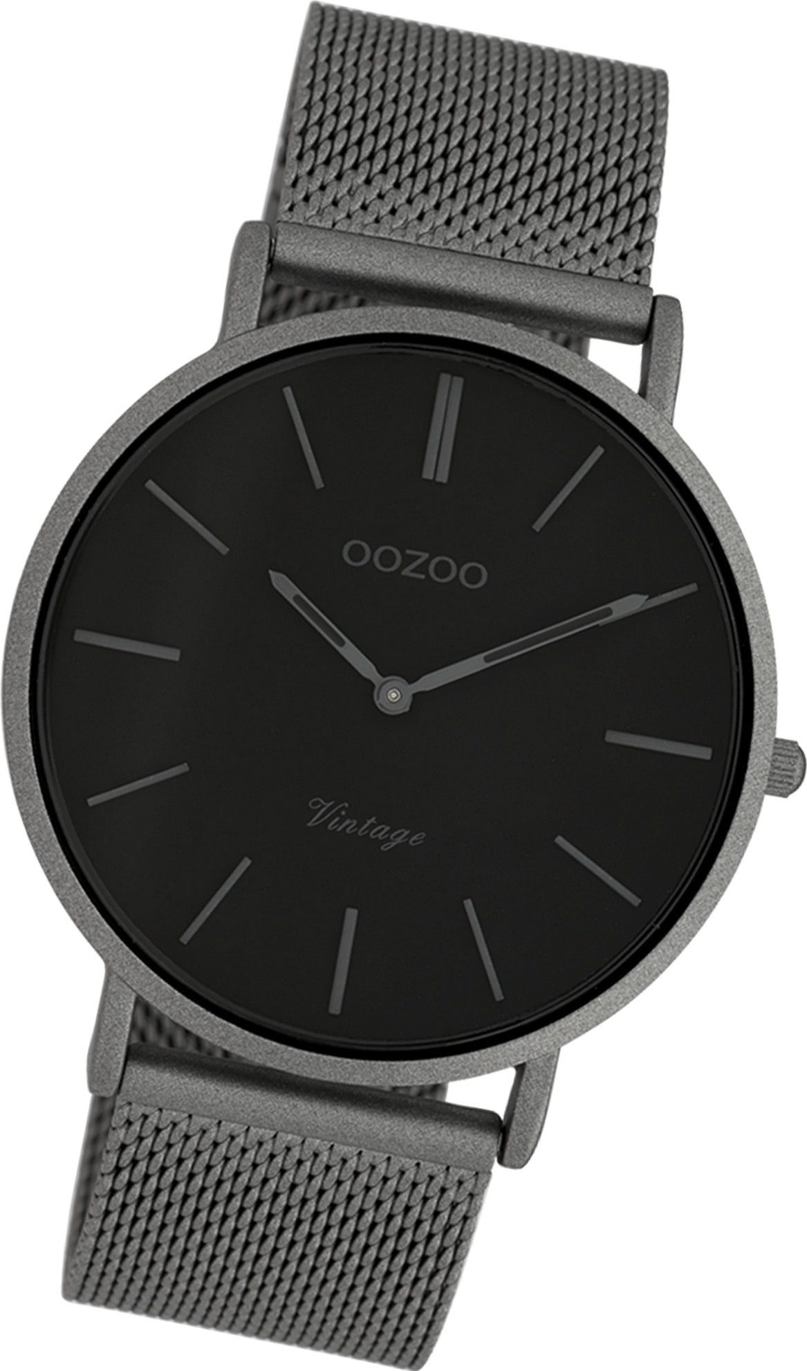 Die Fashion Uhr der Marke Oozoo hat ein schönes Armband aus Edelstahl in grau mit Klappverschluss. Eine Uhr aus der Oozoo Vintage Series Kollektion für Herren in der Gehäusefarbe grau mit Quarzwerk. Die Analoguhr mit Mineralglas hat ein Zifferblatt in der Farbe schwarz. Die Form der Uhr ist rund und das Gehäuse ist groß ca. 40mm.