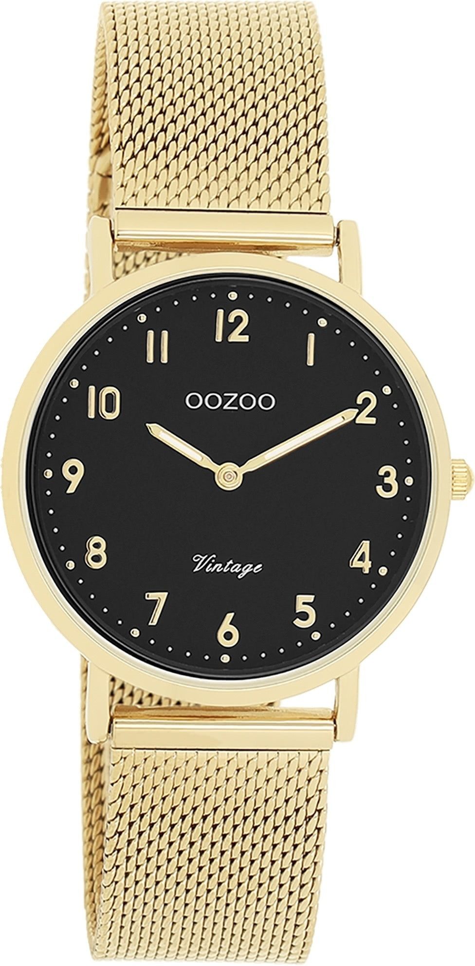 Die Fashion Uhr der Marke Oozoo hat ein schönes Armband aus Metall in gold mit Schiebeverschluss. Eine Uhr aus der Oozoo Vintage Series Kollektion für Damen Herren in der Gehäusefarbe gold mit Quarzwerk. Die Analoguhr mit Mineralglas hat ein Zifferblatt in der Farbe schwarz. Die Form der Uhr ist rund und das Gehäuse ist mittel ca. 32mm.