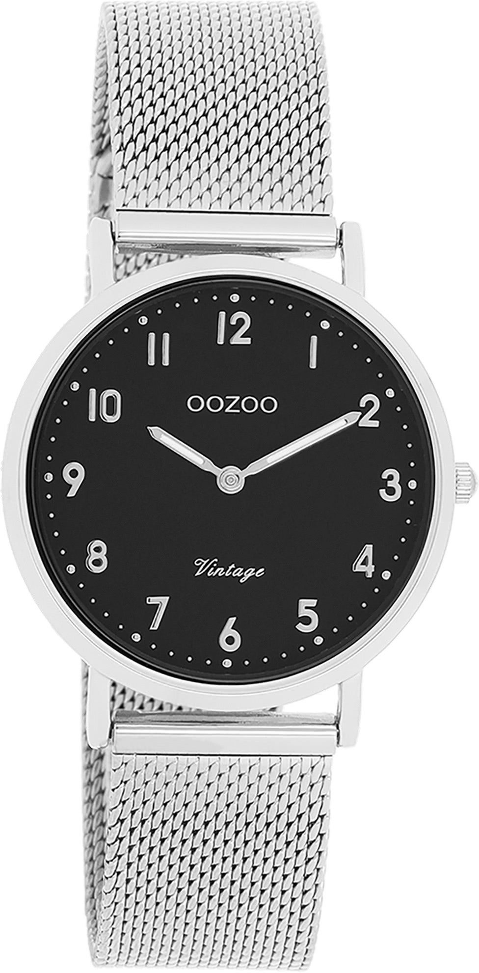 Die Fashion Uhr der Marke Oozoo hat ein schönes Armband aus Metall in silber mit Schiebeverschluss. Eine Uhr aus der Oozoo Vintage Series Kollektion für Damen Herren in der Gehäusefarbe silber mit Quarzwerk. Die Analoguhr mit Mineralglas hat ein Zifferblatt in der Farbe schwarz. Die Form der Uhr ist rund und das Gehäuse ist mittel ca. 32mm.