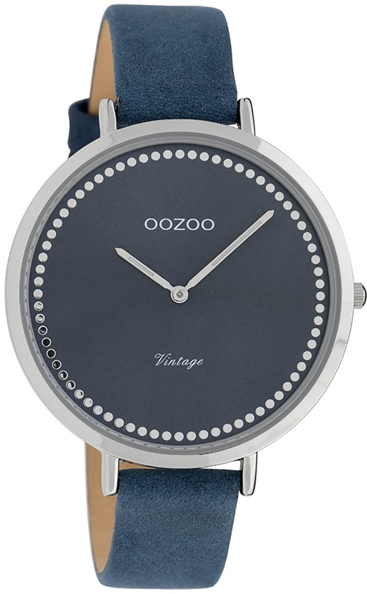 Die Fashion Uhr der Marke Oozoo hat ein schönes Armband aus Leder in blau mit Dornschließe. Eine Uhr aus der Oozoo Vintage Series Kollektion für Damen in der Gehäusefarbe silber mit Quarzwerk. Die Analoguhr mit Mineralglas hat ein Zifferblatt in der Farbe blau. Die Form der Uhr ist rund und das Gehäuse ist groß ca. 40mm.