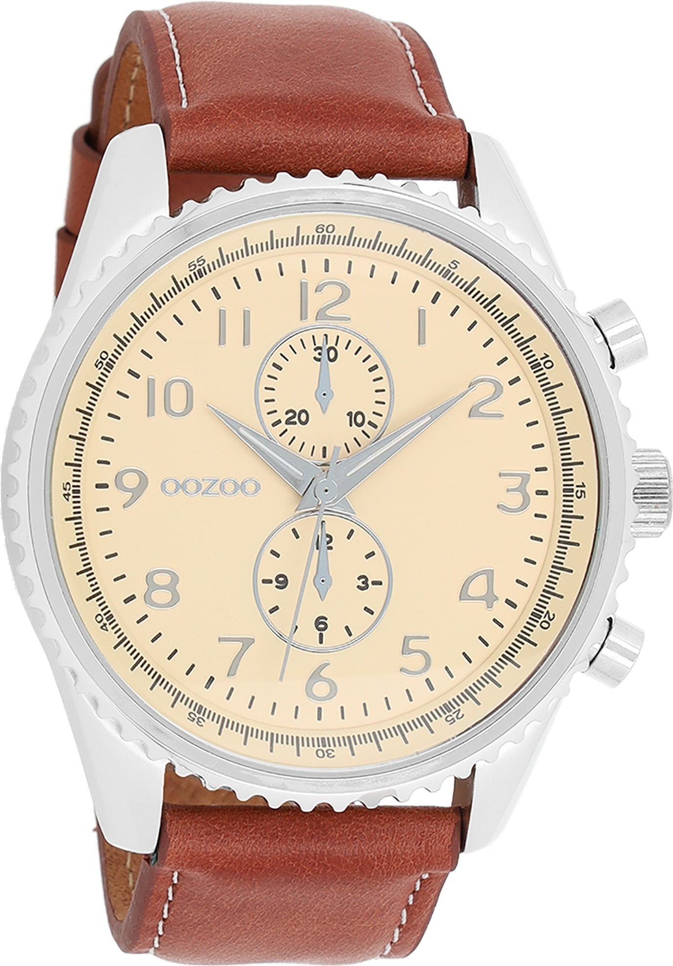 Die Fashion Uhr der Marke Oozoo hat ein schönes Armband aus Leder in braun mit Dornschließe. Eine Uhr aus der Oozoo Timepieces Kollektion für Herren in der Gehäusefarbe silber mit Quarzwerk. Die Analoguhr mit Mineralglas hat ein Zifferblatt in der Farbe beige. Die Form der Uhr ist rund und das Gehäuse ist extra groß ca. 48mm.
