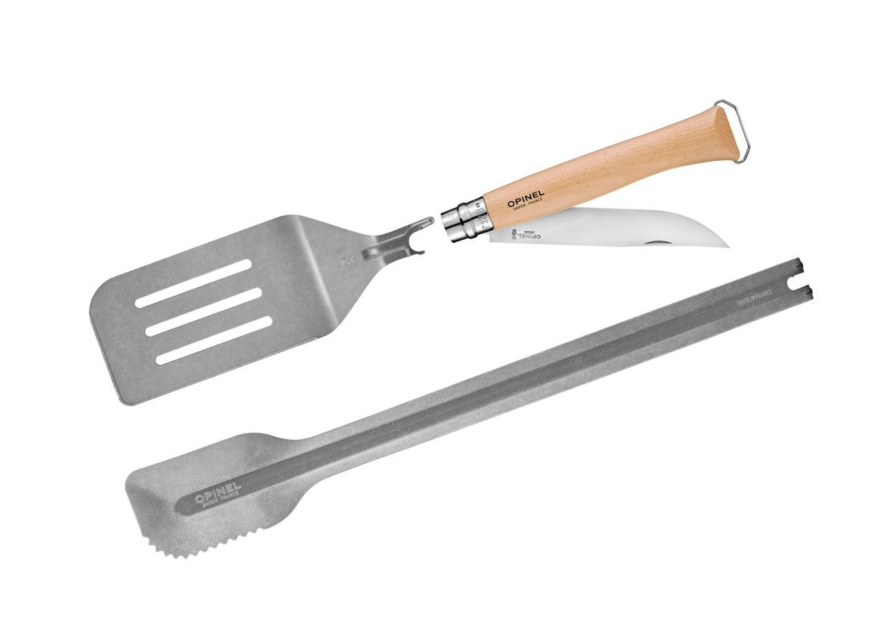 Das Grillset ist der zeitlose Begleiter für gesellige und köstliche Momente. Es ist nützlich und effizient und besteht aus drei Utensilien, die in Frankreich mit Materialien aus der Nähe hergestellt werden: Das Klappmesser Nr. 12 B: eine neue Messergröße mit einer 16 cm langen Klinge aus rostfreiem Stahl und einem Griff aus robustem Buchenholz aus französischen Wäldern. Es ist mit einem Virobloc-Sicherungsring ausgestattet, der die Arretierung der Klinge in geöffneter oder geschlossener Position ermöglicht. Zudem verfügt es über einen Flaschenöffner am Griffende, mit dem man Flaschen öffnen, aber an dem man auch das Messer aufhängen kann. Der Pfannenwender +: Der Pfannenwender aus Edelstahl mit Stonewashed-Finish wird auf den Griff des Messers Nr. 12 B gesteckt und mit dem Ring arretiert. Die große Oberfläche (8,5 cm x 20 cm) ermöglicht ein schnelles Aufnehmen von Lebensmitteln. Er hat einen schmalen Winkel und eine abgeschrägte Kante auf beiden Seiten zum Trennen oder Schaben. Die XL-Zange : Die Zange aus Edelstahl mit Stonewashed-Finish ist 40 cm lang und sorgt für eine einfache und sichere Handhabung. Ihr asymmetrischer Kopf ermöglicht es, große Stücke mit dem gezackten breiten Winkel und kleinere mit dem schmalen Winkel zu greifen. Sie besitzt außerdem am Ende über einen Rostheberschlitz.