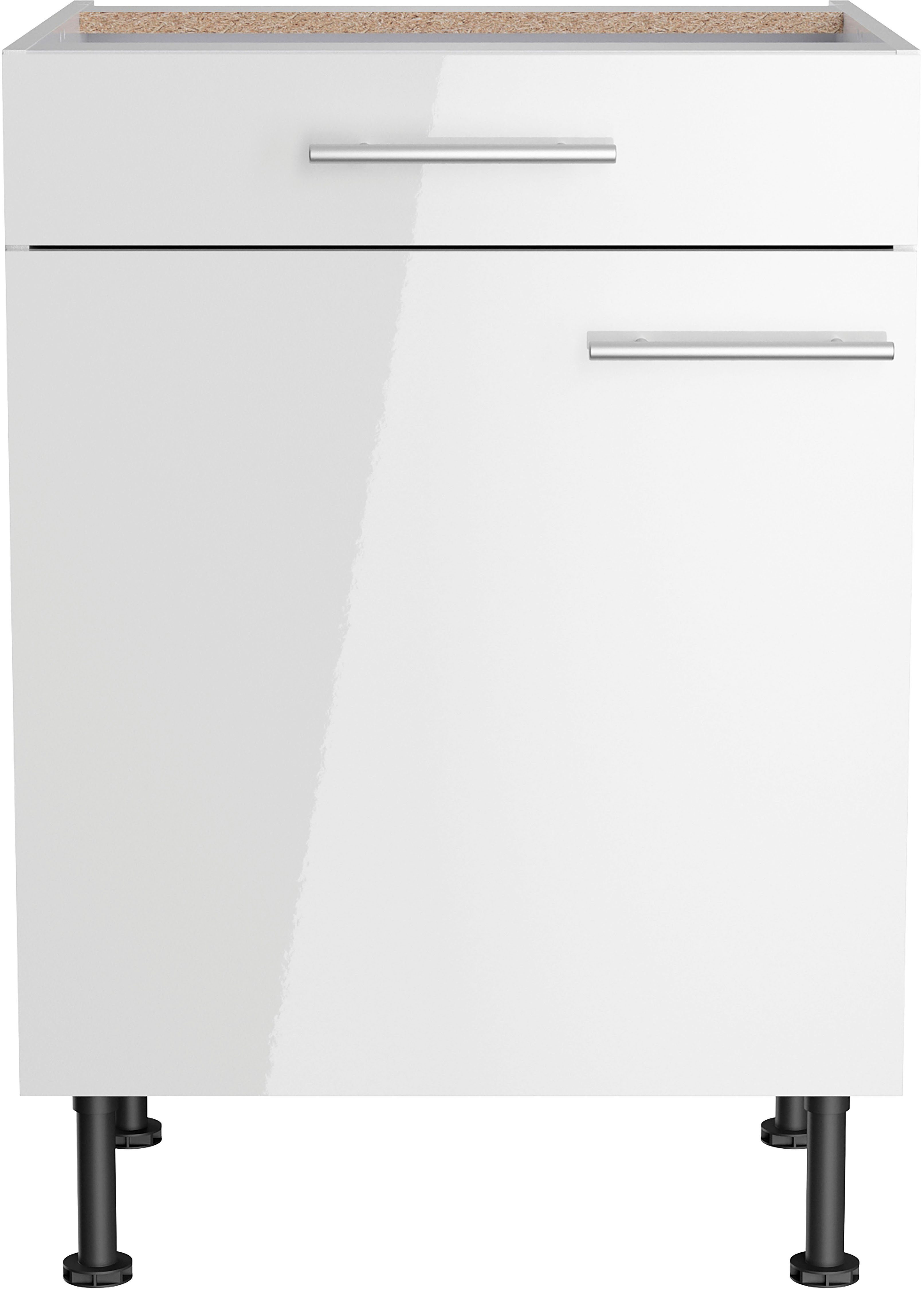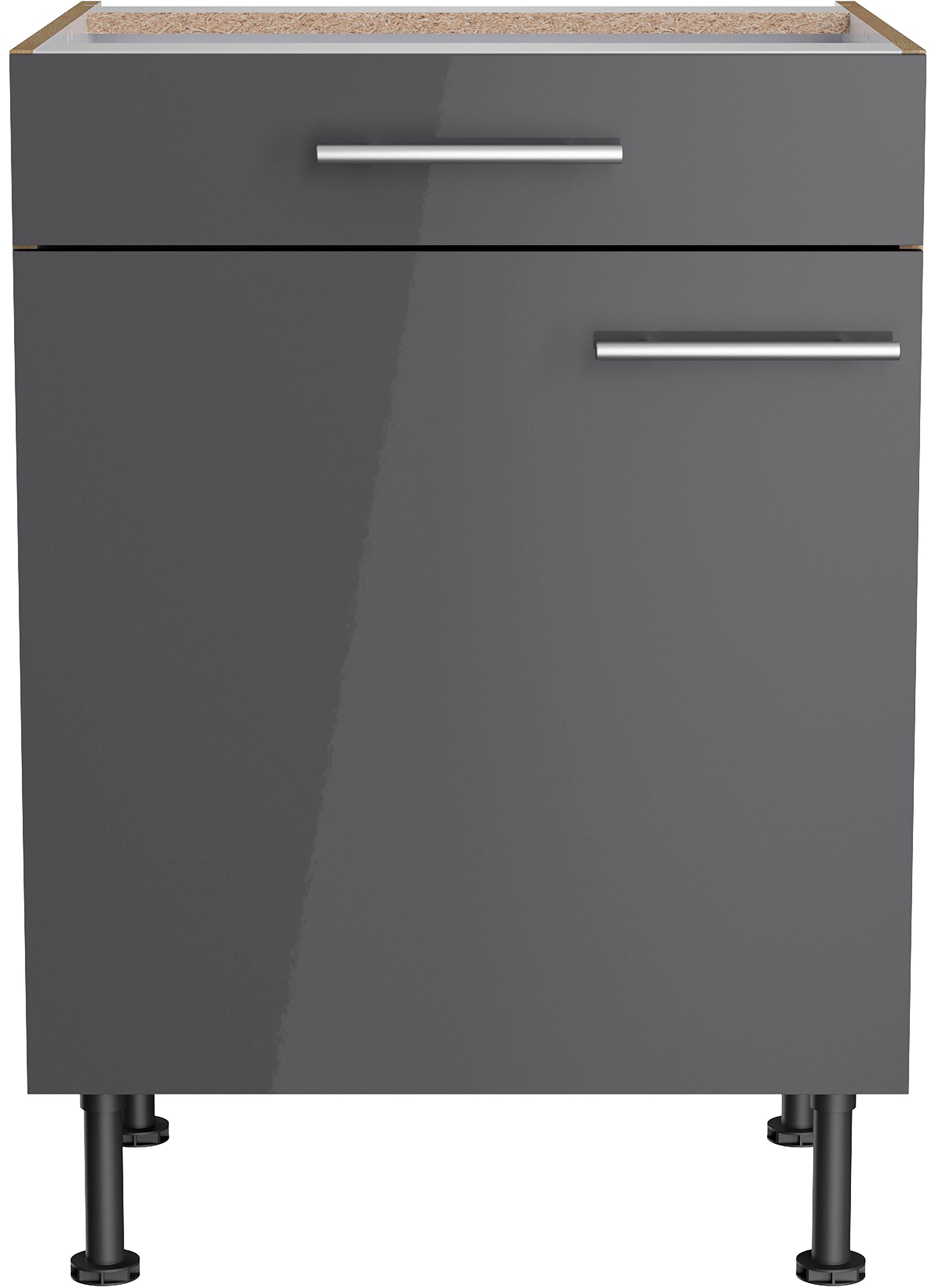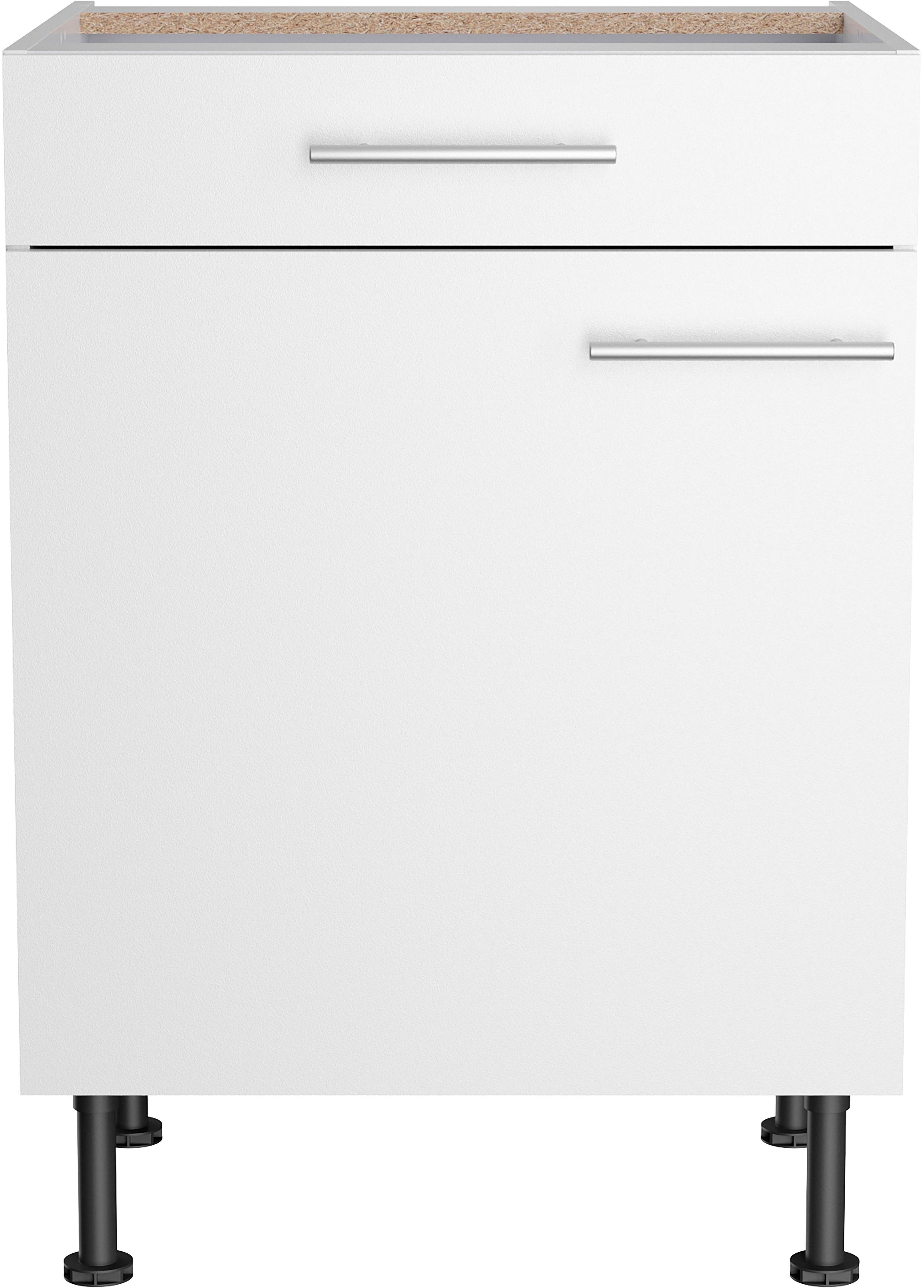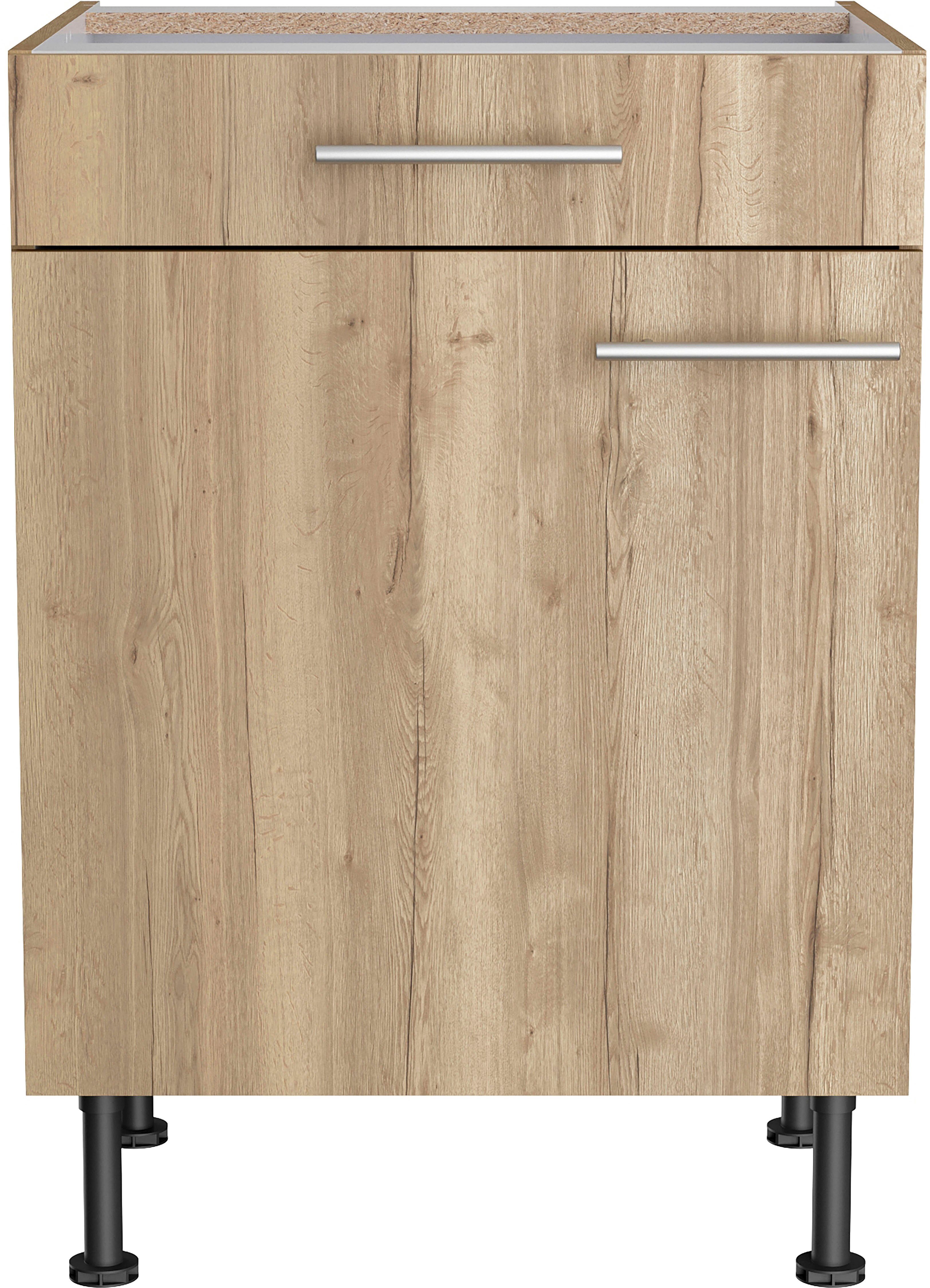 Mit dem Unterschrank »Klara« von OPTIFIT bekommst du Design und Funktionalität in einem. Die Öffnungsrichtung kannst du nach Belieben festlegen, da der Türanschlag sowohl rechts als auch links angebracht werden kann. Die Schubladen lassen sich komplett ausziehen und bieten dir weitere Unterbringungsmöglichkeiten. Um den Schrank genau auf deine Bedürfnisse auszurichten, sind die Einlegeböden flexibel einsetzbar. Mit den höhenverstellbaren Füßen kannst du die Schrankhöhe flexibel anpassen, um sie beispielsweise anderen Möbeln anzugleichen.