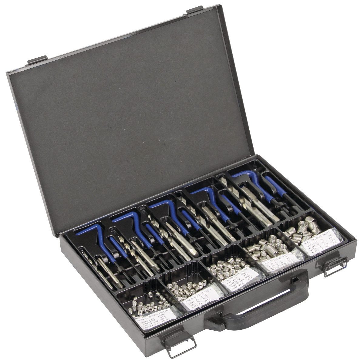 Optimum 3202010 Gewindereparatur-Меню 5 Stück Spiralbohrer (5,2 mm/6, 3mm/8,3 mm/10,4 mm/12,4 mm)5 Stück Gewindebohrer (M5 / M6 / M8 / M10 / M12) 5 Stück Eindreher für Gewindeeinsätze 5 Stück Zapfenbrecher 100 Stück Gewindeeinsätze: je 25 Stck. M5x0,8 mm / M6x1,0 /M8x1,25 / M10x1,5 10 Stück Gewindeeinsätze M12x1,75 mm Zur Reparatur defekter Gewinde Zur Gewindepanzerung von Werkstoffen geringer Scherfestigkeit Praktische OPTIMUM Metallkassette