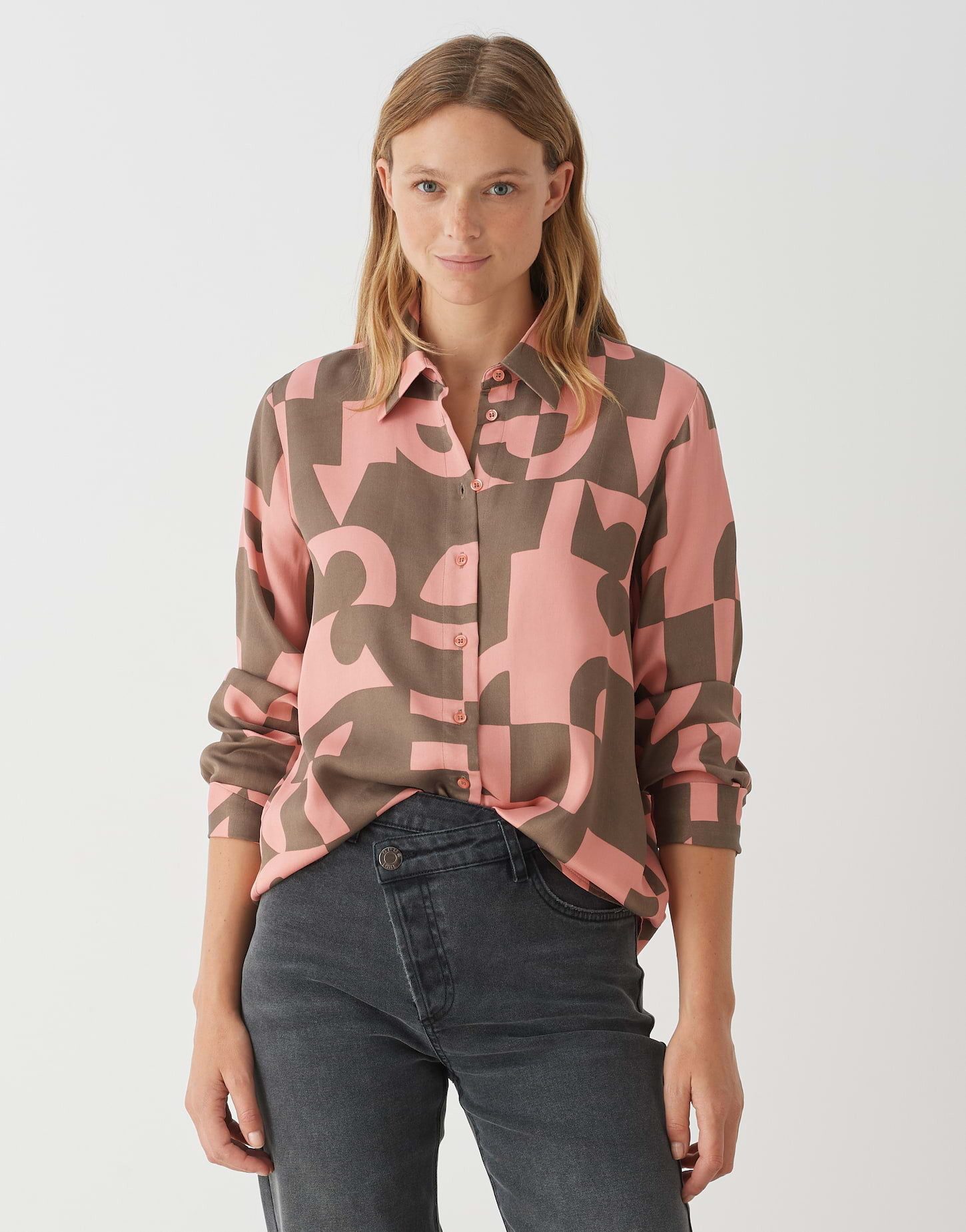 Die stilvolle Hemdbluse aus einem leicht glänzenden Satin-Stoff legt den Fokus auf den abstrakten Allover Print und bringt schöne Akzente in die Looks.