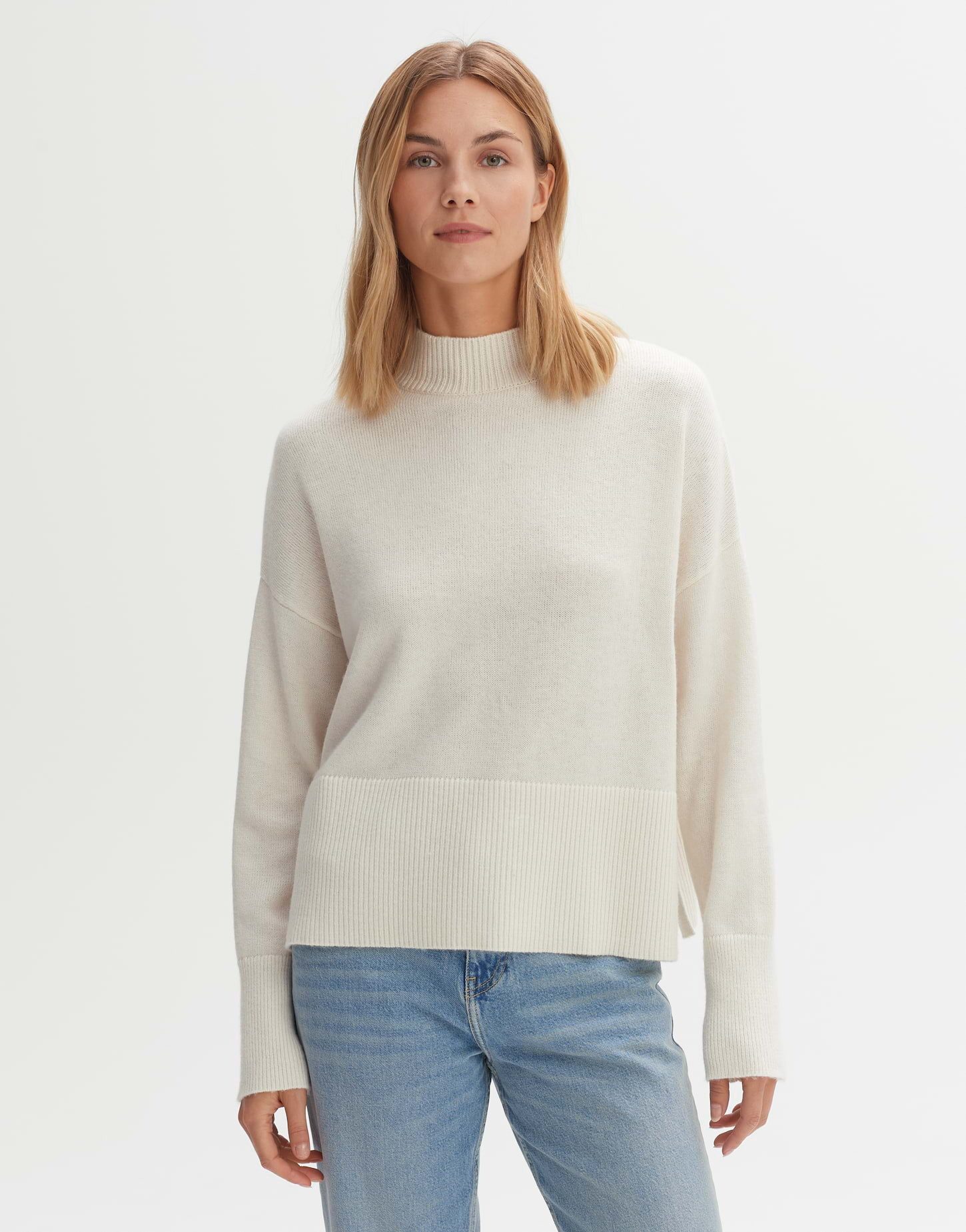 Der Pullover aus einem flauschigen Woll-Mix erinnert an einen Kaschmirpullover und verbirgt in der Oberfläche eine subtile Melange-Optik. Der große, halsferne Kragen und der weite Schnitt verleihen dem Stricker einen modernen Twist.