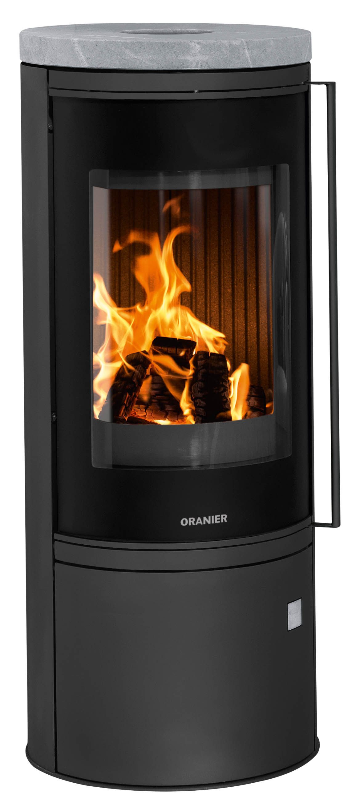 Für wohltuende Wärme im Raum und eine gemütliche Atmosphäre: Der runde Kaminofen »Arena 2.0« von Oranier mit einer Verkleidung aus Speckstein und Stahl und einer Feuerraumauskleidung aus Vermiculite.