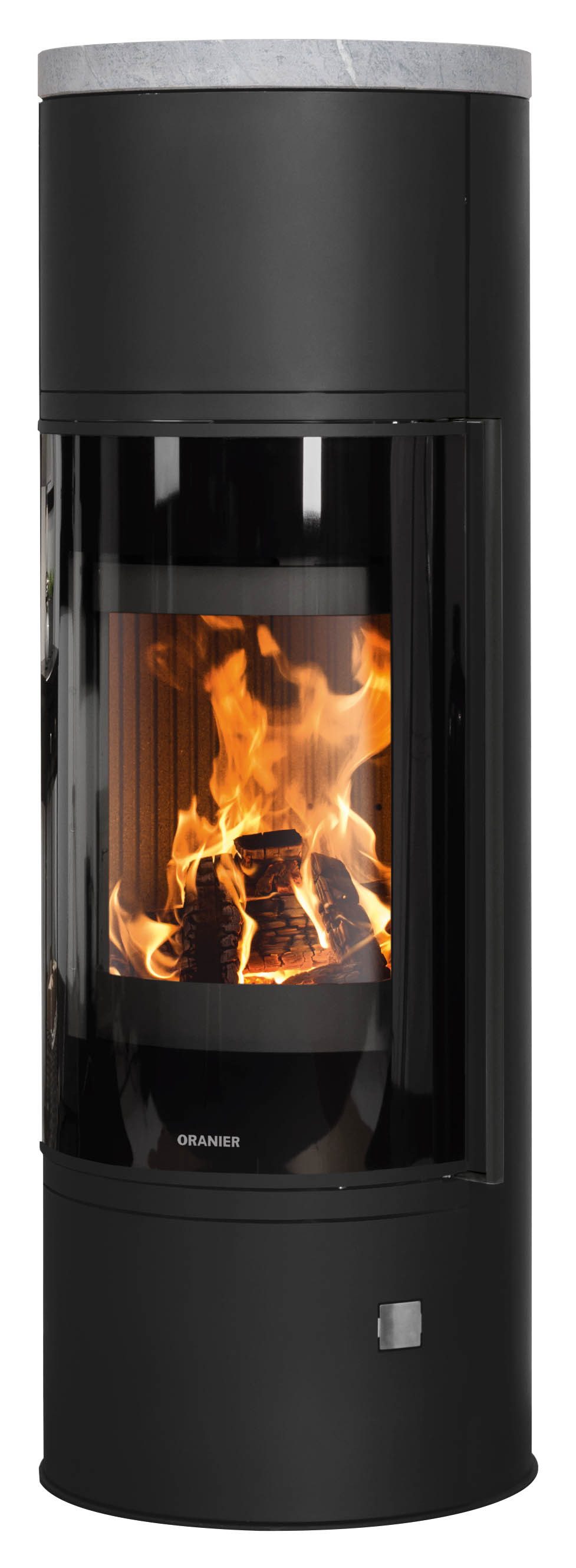 Für wohltuende Wärme im Raum und eine gemütliche Atmosphäre: Der runde Kaminofen »Arena Aqua 2.0« von Oranier mit einer Verkleidung aus Speckstein und Stahl und 8,5 kW Nennwärmeleistung.