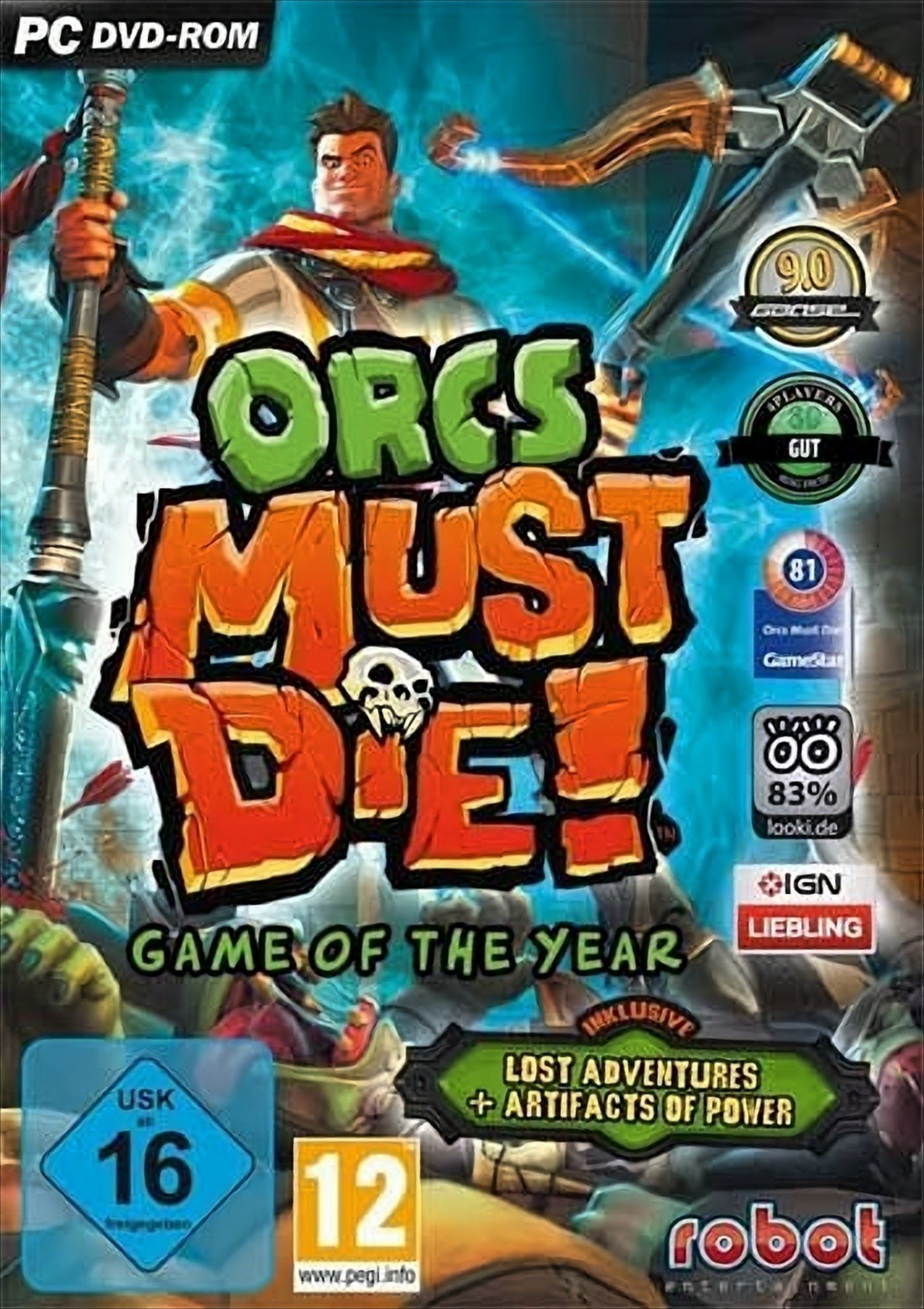 Spielbeschreibung | Zerstückeln Sie sie, verbrennen Sie sie, spießen Sie sie auf und schießen Sie auf sie. In diesem Fantasy Action Strategie Spiel müssen Orks sterben, egal wie Sie es anrichten.Als ein mächtiger Kriegsmagier mit tödlichen Waffen, Zaubern und Fallen zur Hand, verteidigen Sie 24 Festungen gegen eine tobende Herde von bestialischen Gegnern, bestehend aus Ogern, Höllenfledermäusen und natürlich einer ganzen Menge widerwärtiger Orks. Bekämpfen Sie Ihre Gegner durch eine handlungsreiche Kampagne mit verschiedenen Schwierigkeitsgraden, einschließlich des brutalen Albtraum Modus!Orcs Must Die! Artifacts of PowerErweitern Sie ihr Orcs Must Die! Arsenal mit zwei neuen Waffen sowie zwei neuen Fallen. Mit den Artefakten der Macht in ihrem Zauberbuch reißen Sie ganze Level ein, verdrängen Ihre Freunde aus der Rangliste und am wichtigsten, vernichten mit Leichtigkeit einen Haufen Orks. Nur das Beste für den Letzten der Kampfmagier!Features:Neue Verbesserungen: Verwenden Sie Schädel, um neue Verbesserungen für den Schock Knipser und den Bodenbrenner zu erwerben.Tornister des Alchemisten: Legen Sie tödliche Giftbomben, um mehrere Orks auf einmal zu verätzen.Schock Knipser: Mit diesem überdimensioniertem Plagenentferner knallen Sie Flieger und Bodeneinheiten gleichermaßen ab.Vampirstulpen: Entziehen Sie Ihren Gegnern Lebensenergie, um sich zu heilen.Bodenbrenner: Überraschen Sie ganze Wellen von unaufmerksamen Gegnern mit diesem aufklappendem Brennofen.Orcs Must Die! Lost AdventuresSie denken, Sie hätten genug Orks getötet? Denken Sie nochmal darüber nach! Kehren Sie in die tote Welt hinter den Tälern zurück und verteidigen Sie sich in einer neuen Serie herausfordernder Festungskämpfe gegen die Orks. In Orcs Must Die! Lost Adventures reisen Sie aus den Tiefen der Grube zu den schmalen Pfaden hoch über der Großen Schlucht. In The Lost Adventures steht der Kriegsmagier den fünf wohl tödlichsten Grabenkämpfen seines Lebens gegenüber!Features:Fünf neue Level: Testen Sie Ihr Können in einer Reihe herausfordernder neuer Belagerungen!Zwei neue Gegnertypen: Fürchten Sie den eiskalten Atem der Frost Fledermaus und hüten Sie sich vor den schwächenden Magie Attacken des Zyklopmagiers!Neue Ranglisten: Fordern Sie Ihre Freunde heraus und erreichen Sie die Höchstpunktzahlen für die fünf neuen Level.Neue Schädel Belohnungen: Verdienen Sie sich bis zu 50 zusätzliche Schädel Belohnungen, um Ihr Fallen Arsenal weiter auszubauen!Neue Bonus Falle!: Platzieren Sie den Mana-Brunnen an strategischen Stellen rund um die Festung, um im richtigen Moment einen Mana Schub zu erhalten!Werden Sie die Orks in einer Lavagrube braten, sie mit einer Deckenfalle platthämmern oder sie gefrieren und mit einem Hieb zerschlagen?Egal welche Waffen und Fallen Sie wählen, es wird auf jeden Fall ein Ork-vernichtender Spaß!Sprache/Untertitel: DeutschHandbuch: Deutsch |