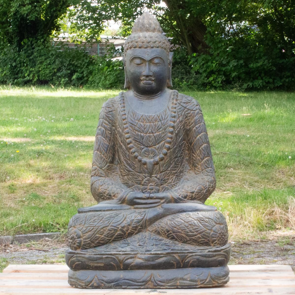 Diese kunstvoll gearbeitete Buddha Figur im Meditationssitz wurde in Indonesien aus massivem Greenstone gefertigt – einem Naturstein, der durch seine hohe Dichte und Robustheit besonders für den Außenbereich geeignet ist. Mit einer Höhe von ca. 80 cm, einer Breite von etwa 50 cm und einer Tiefe von ca. 36 cm strahlt die Skulptur Ruhe und spirituelle Kraft aus. Die detaillierten Ornamente und die antik anmutende Oberfläche machen sie zu einem Blickfang in jedem Garten oder Eingangsbereich. Durch das Gewicht von ca. 107 kg (ohne Holzgestell) ist sie besonders standfest. Kleine Unterschiede in Struktur, Farbe und Oberflächenwirkung sind Teil des Herstellungsprozesses und machen jede Skulptur zu einem echten Unikat.