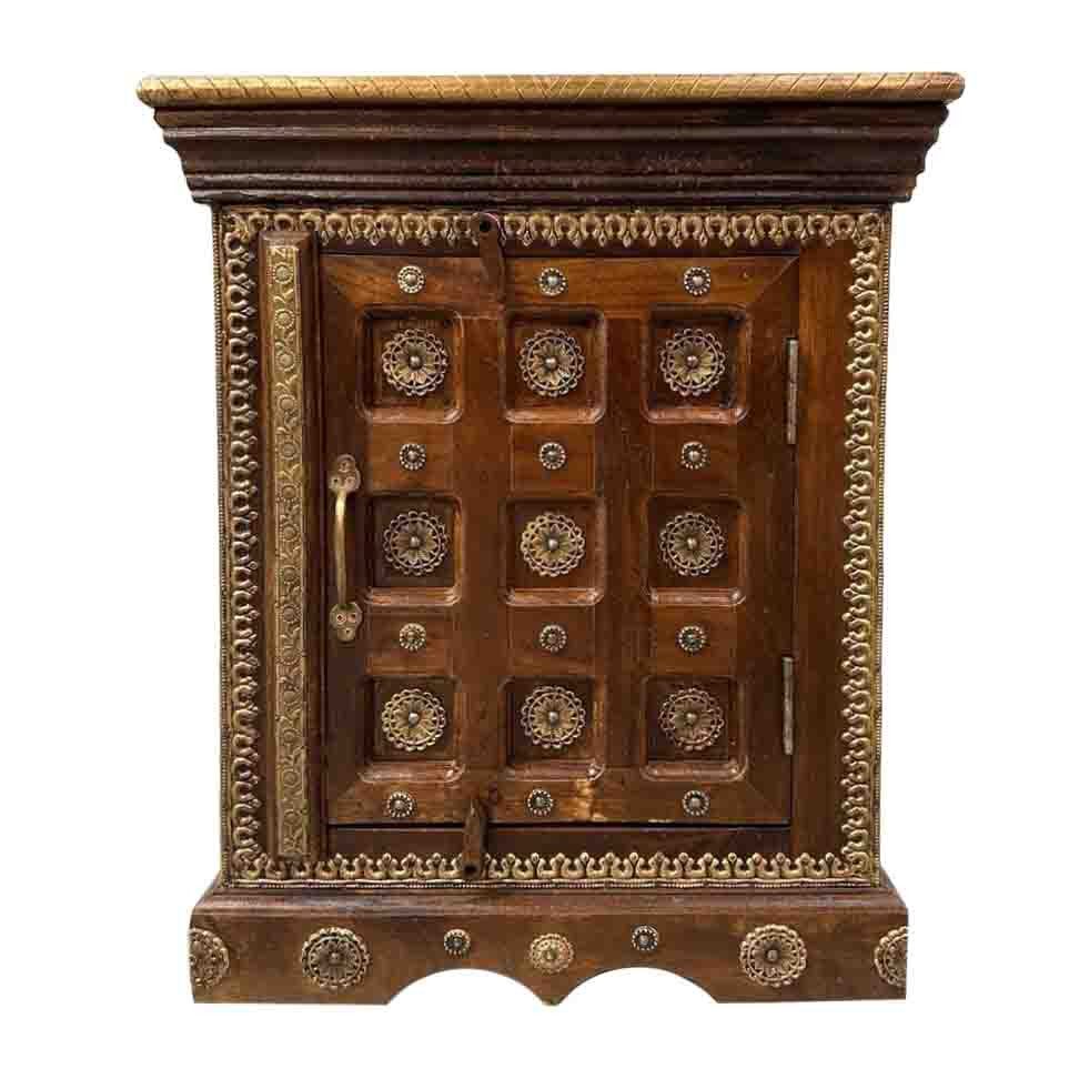 Großräumige Nachtkommode im antiken Look mit mächtigen Messingbeschlägen. Die einzigartige Nachtkommode wurde in liebevoller Handarbeit aus hochwertigem Mangoholz in Indien gefertigt.