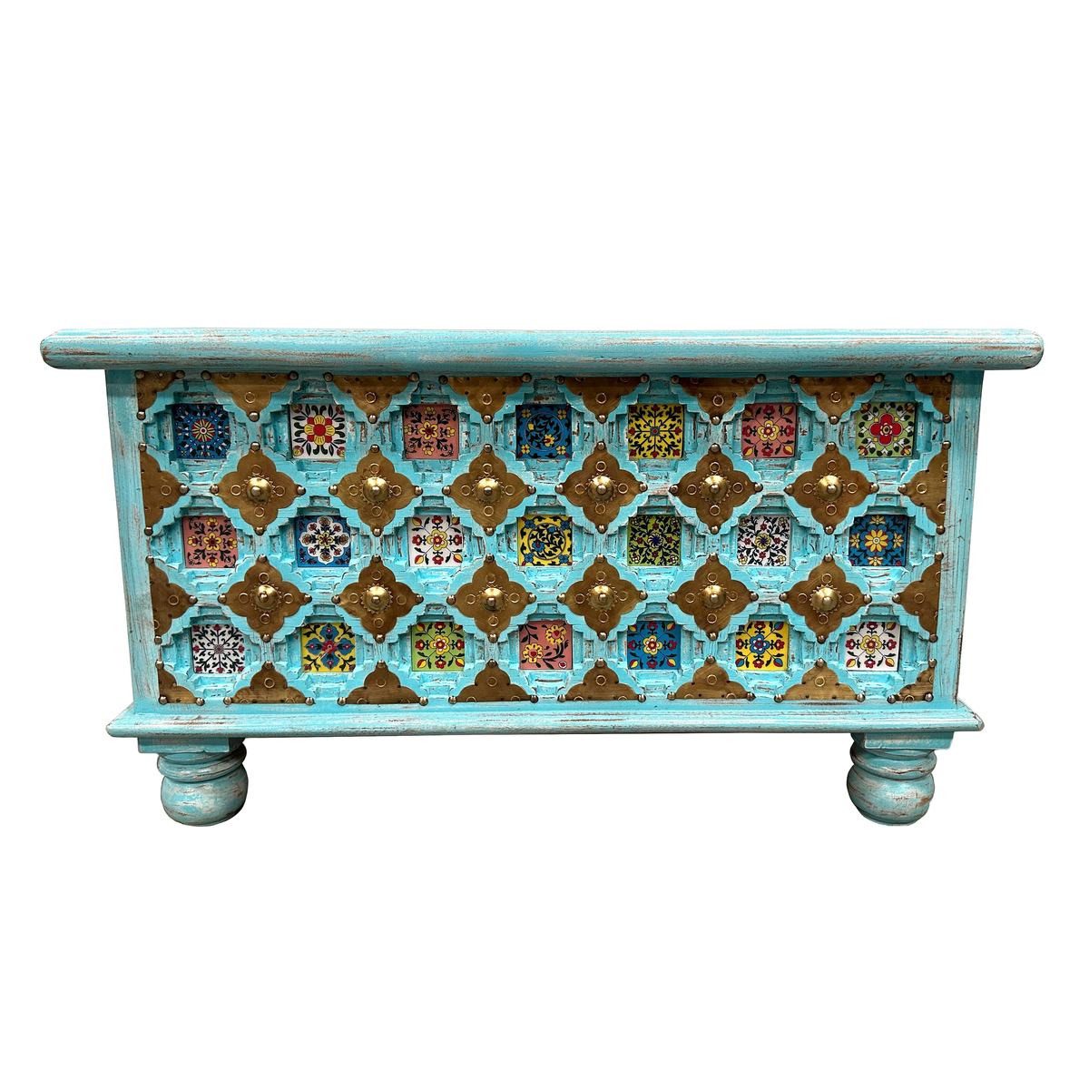 Die einzigartige Truhe wurde in liebevoller Handarbeit aus Holz in Indien gefertigt. Das antike Dekor der Truhe besticht besonders durch die altertümlichen Messingbeschläge.