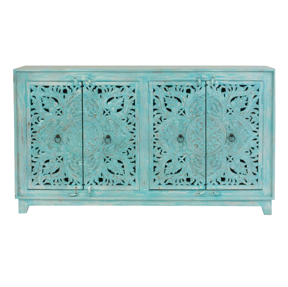 Sideboard mit handgeschnitzter Front und floralen Motiven. Die Rückwand ist ansprechend gestaltet, sodass das Sideboard auch freistehend platziert werden kann.