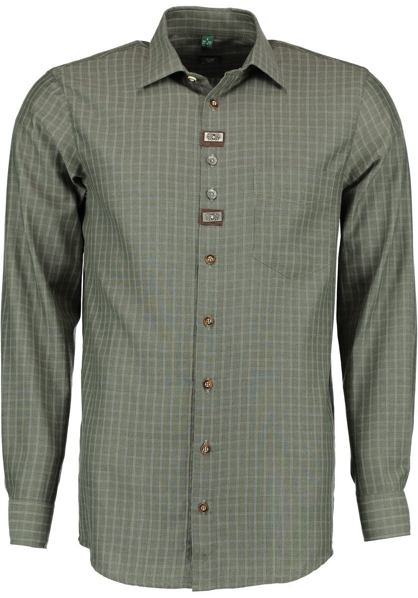 Oliv oder Trachtengrün? Gleich in zwei Grüntönen aus der Natur bietet OS Trachten dieses dezent geschmückte Trachtenhemd an. Die Knopfleiste zieren - abwechselnd mit Knöpfen in Hirschhornoptik - Metallknöpfe und Edelweiß-Stickerei. Bewährt sind Material und Schnitt: Reine, atmungsaktive Baumwolle im bequem weiten "Regular Fit". Typisch für OS Trachten ist auch die breite Größenauswahl von Kragenweite 35 bis 53.