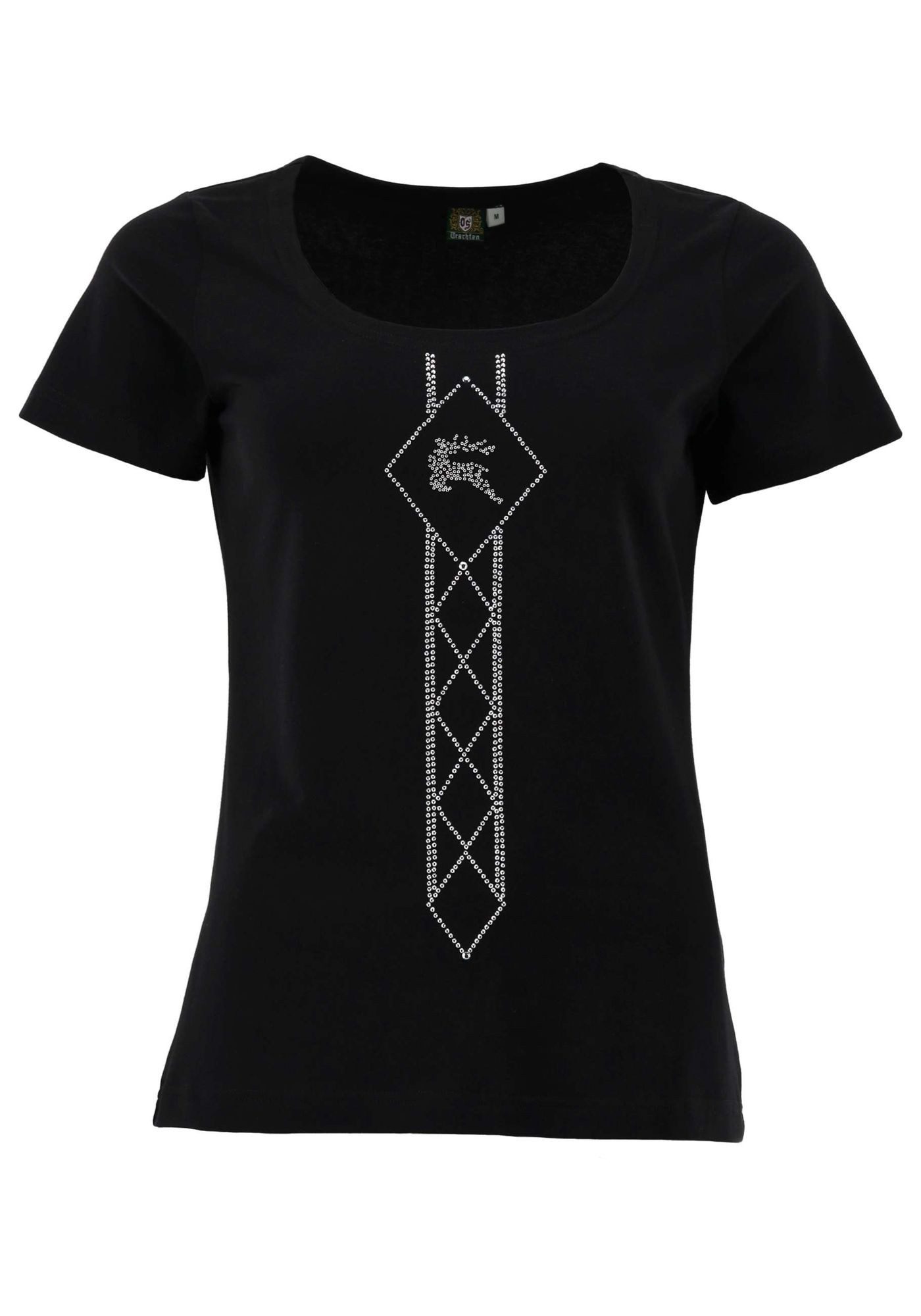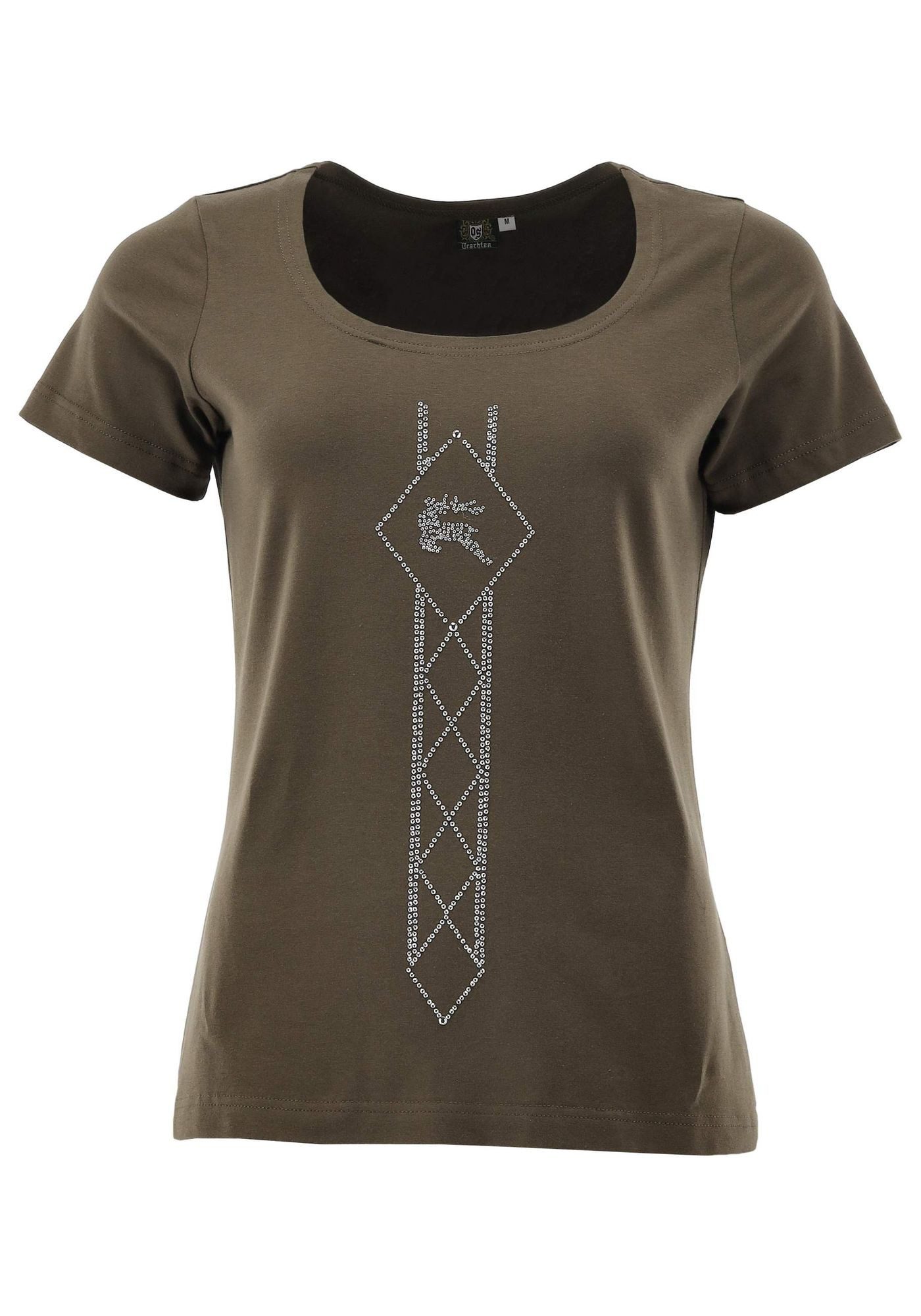 Besondere Merkmale | Tailliert, Rundhalsausschnitt, 1/2-Arm, Strass-Hirsch auf dem Rumpf |