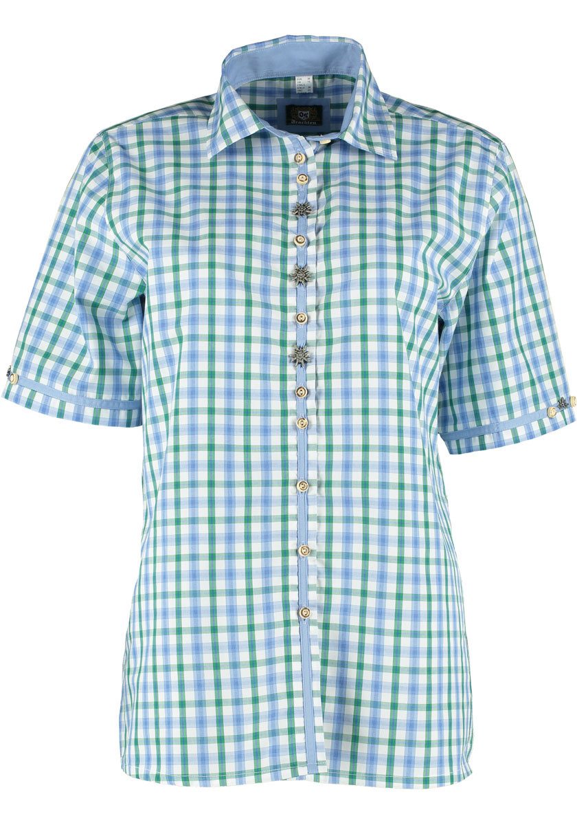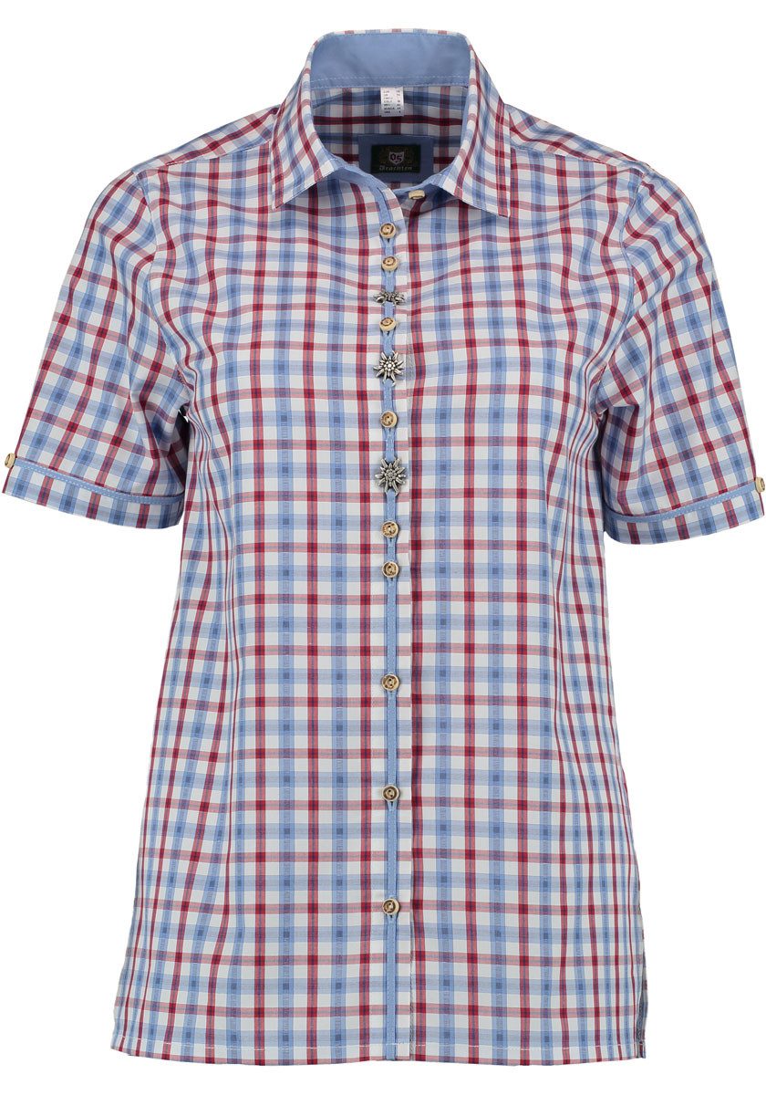 Besondere Merkmale | Damen Kurzarmbluse mit Edelweiß-Zierteilen auf der Knopfleiste |