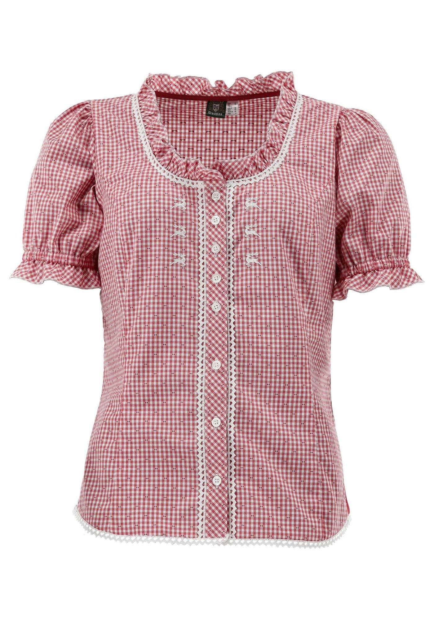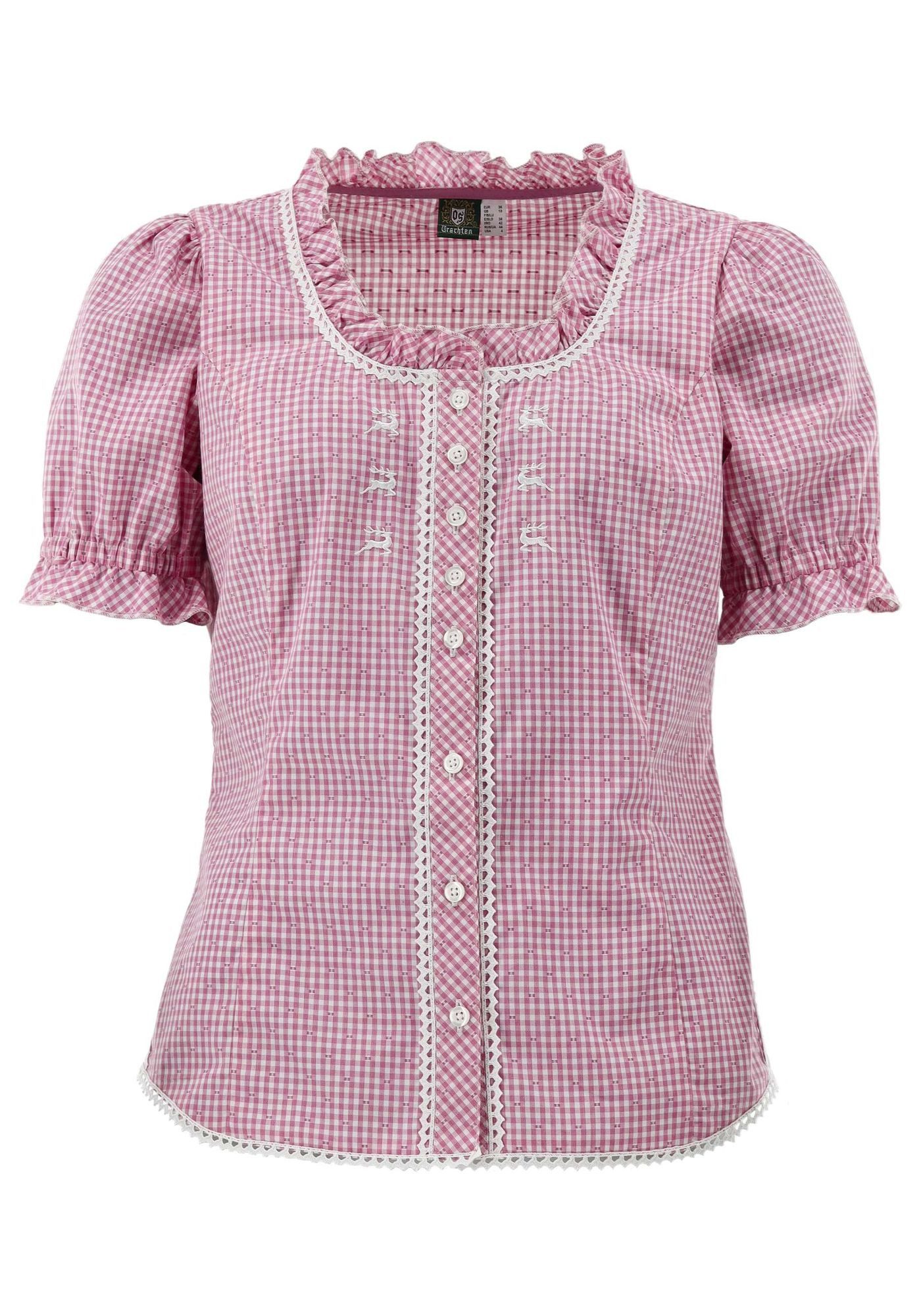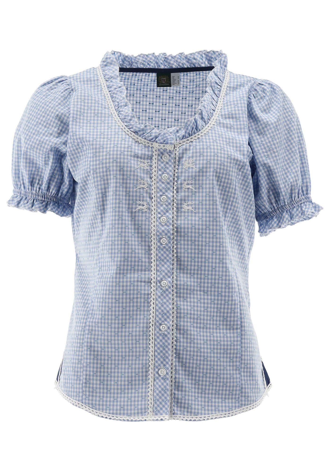 Diese Damenbluse im traditionellen Landhausstil verbindet klassische Eleganz mit verspielten Details. Das zarte hellblaue Vichy-Karo sorgt für einen frischen, sommerlichen Look und lässt sich vielseitig kombinieren - ob zur Jeans, zum Rock oder als Ergänzung zum Dirndl-Outfit. Die kurzen Puffärmel mit elastischem Bund und Rüschenabschluss verleihen der Bluse eine feminine Note, während der leicht geraffte Rundhalsausschnitt mit Rüschen romantische Akzente setzt. Die durchgehende Knopfleiste ist mit dekorativer Borte eingefasst und wird von feinen Stickereien entlang der Brustpartie ergänzt. Dank taillierter Schnittführung betont die Bluse die Figur, ohne einzuengen, und bietet zugleich hohen Tragekomfort. Das atmungsaktive Baumwollmaterial liegt angenehm auf der Haut und ist ideal für warme Tage geeignet. Ob fürs Volksfest, den Biergartenbesuch oder als stilvolle Ergänzung zur Alltagsmode - diese Bluse vereint Tradition und moderne Leichtigkeit. Ein Must-have für alle, die Wert auf feminine Details und authentischen Trachtencharme legen.