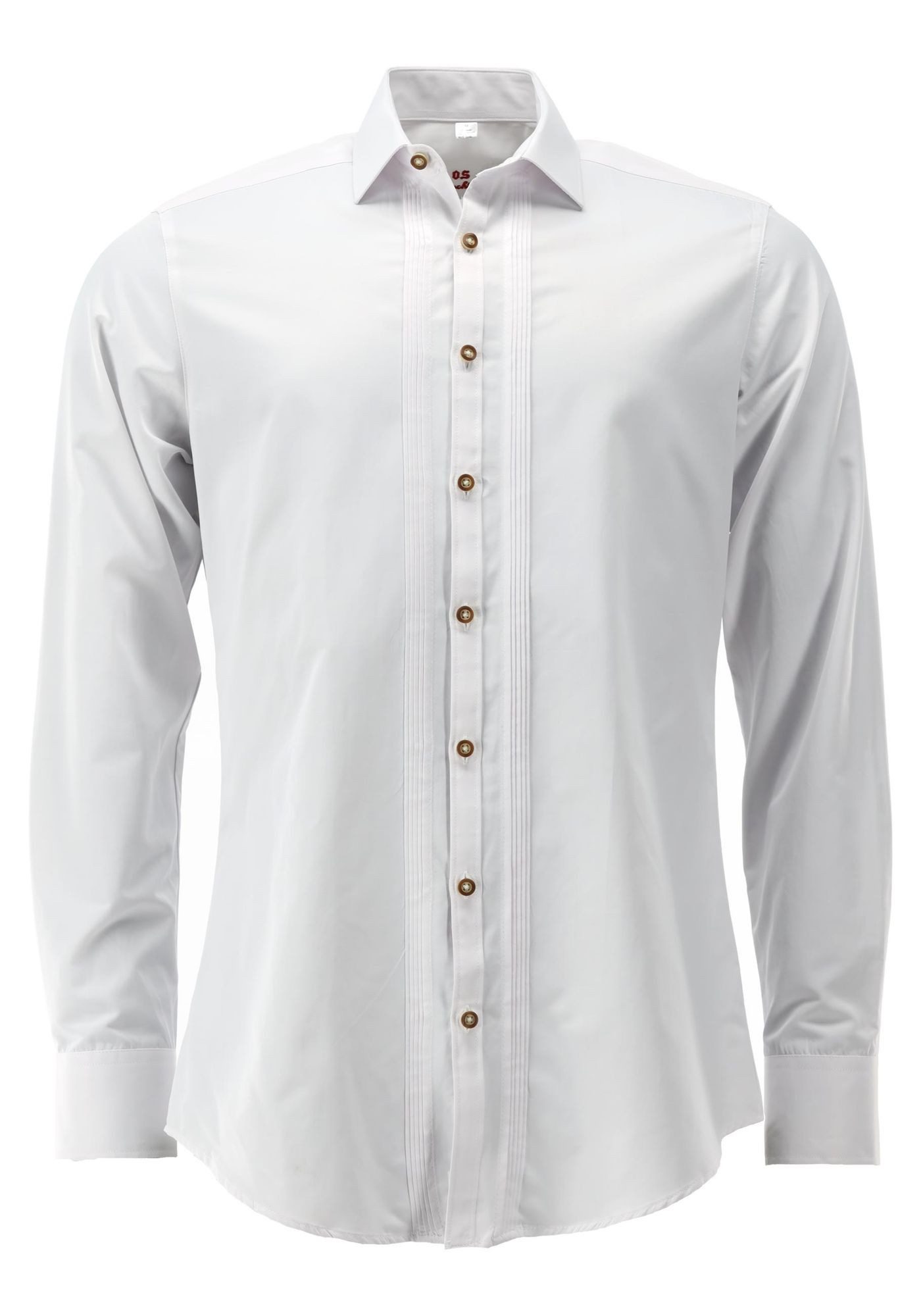 Für die besonderen Anlässe: das weiße Trachtenhemd von OS Trachten mit Haifischkragen und schmückenden Biesen entlang der Knopfleiste. Die Knöpfe in Hirschhorn-Optik bilden auf dem weißen Gewebe schöne Kontraste runden das stimmige Gesamtbild ab. Apropos Gewebe: hier hat der Trachtenspezialist auf eine Baumwollmischung gesetzt, denn die ist knitterarm und äußerst pflegeleicht. Mit extra langem Rumpf und extra langen Ärmeln von Kragenweite 35 bis 53.