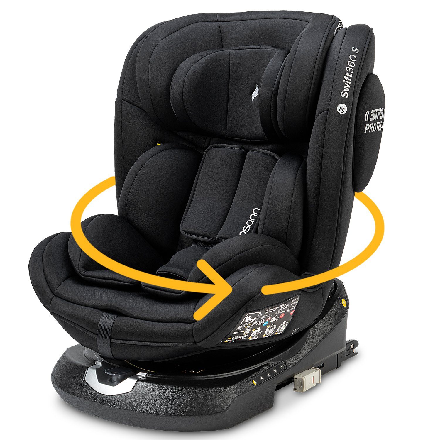 Unser Swift360 S ist der erste drehbare Kinderautositz seiner Klasse, der von 76 bis 105 cm reboard fahren kann. Er ist der perfekte Nachfolgesitz nach einer Babyschale, denn Experten empfehlen bis zu einem Alter von 24 Monaten rückwärts zu fahren. In gleicher Größenklasse bietet er aber zugleich die Option vorwärtsgerichtet zu fahren. Die 360-Grad-Drehfunktion unterstützt Eltern beim Ein- und Aussteigen und die höhenverstellbare Kopfstütze und das damit automatisch mitwachsende 5-Punkt-Gurtsystem passen sich hervorragend an das Wachstum von Mini an. In der Größenklasse 100–150 cm wird das 5-Punkt- Gurtsystem ausgebaut und das Kind mit dem 3-Punkt-Gurt des Autos gesichert.