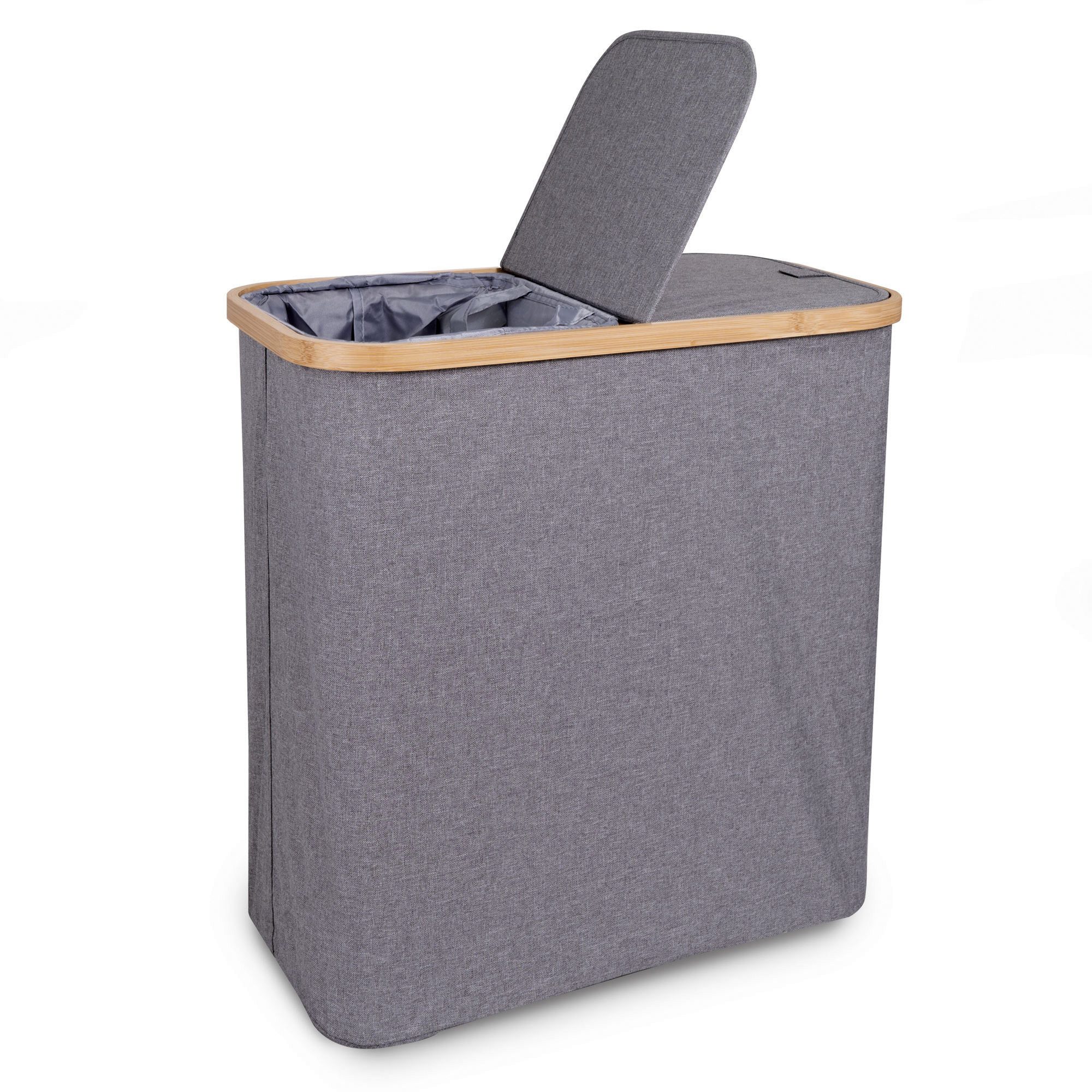Dieser praktische Wäschekorb mit seinem großzügigen Fassungsvermögen von 115 Litern ist die perfekte Lösung für ein sauberes und organisiertes Zuhause. Dank der intelligenten Aufteilung in zwei separate Fächer können Sie Ihre Wäsche bequem nach Farben oder Stoffarten sortieren und so Ihren Waschtag erleichtern.