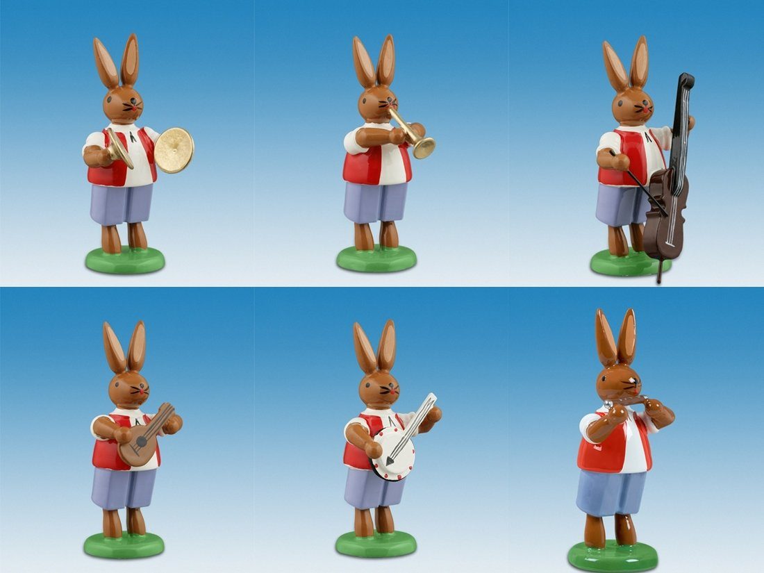 Diese schönen Osterhasen haben eine Höhe von 7,5 cm und ist farbig gestaltet. Die Hasen mit Hemd, Weste und Hosen stehen auf einem kleinem Sockel und halten das Instrument in den Händen. Всеs wird in verschiedenen Arbeitsschritten komplett aus Holz im Erzgebirge gefertigt