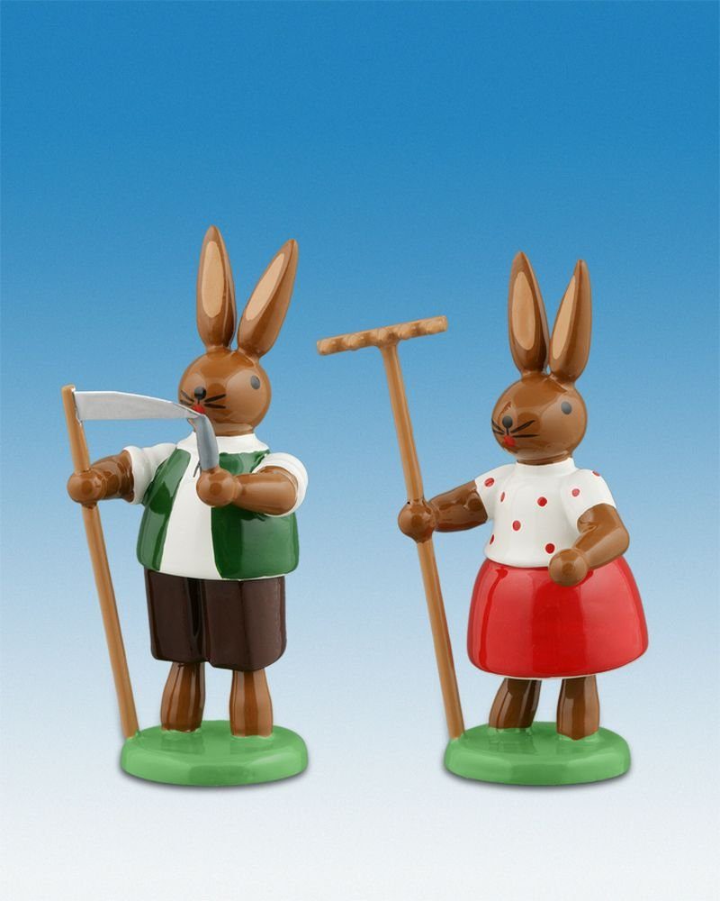 Osterdekoration Osterhasenpaar mit Rechen & Sense Dieses schöne Osterhasenpaar hat eine Höhe von 7,5 cm und ist farbig gestaltet. Beide stehen auf einem kleinem Sockel und halten in den Händen Rechen und Sense. Всеs wird in verschiedenen Arbeitsschritten komplett aus Holz im Erzgebirge gefertigt Höhe 7,5cm NEU |