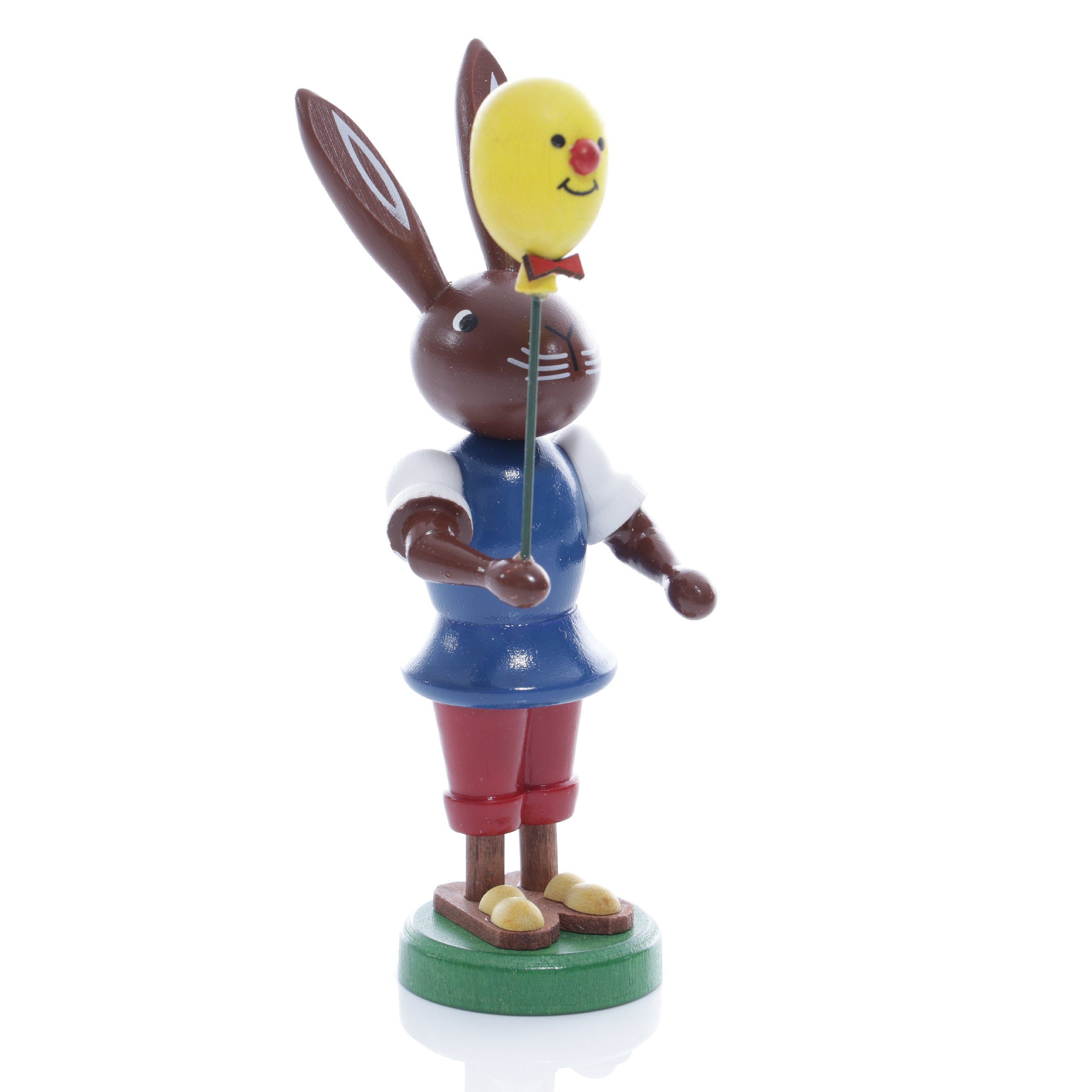 Osterfigur Hase mit Luftballon Dieser schöne Osterhase hat eine Höhe von 9 cm. Er ist bunt bemalt, braun ist das Fell, der Oberkörper rot und weiß und die Hose ist blau. In der rechten Hand hält er einen großen runden gelben Luftballon mit einem niedlichen Gesicht drauf und einer roten Schleife. Всеs wird in verschiedenen Arbeitsschritten komplett in Seiffen in einem kleinen Familienbetrieb gefertigt. Toll als Deko auf dem festlichen Ostertisch. Höhe ca 9 cm NEU |
