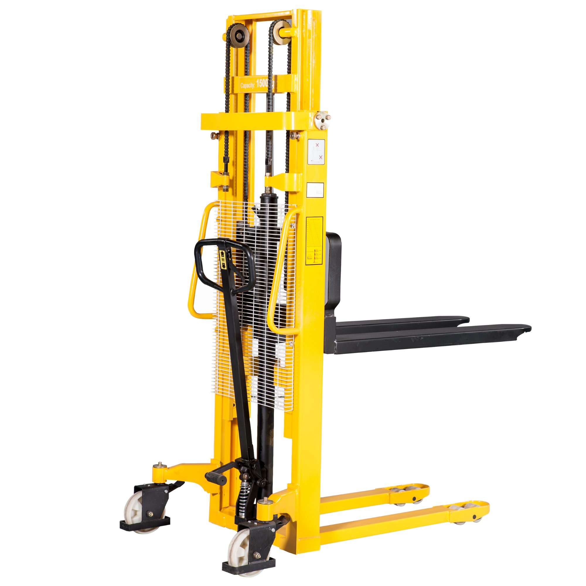 Das kontrollierte Absenken der Hubgabeln erfolgt stufenlos über einen Hebel im Deichselgriff. Ein Schutzgitter verhindert, dass Ladung von der Palette durch das Hubgerüst auf den Anwender fallen kann. Mit dem Handstapler können viele Verladeprozesse und Arbeiten im Palettenregal Lager schnell und unkompliziert erledigt werden. Mit der Tragkraft von einer Tonne stellen schwer beladene Paletten kein Problem dar.