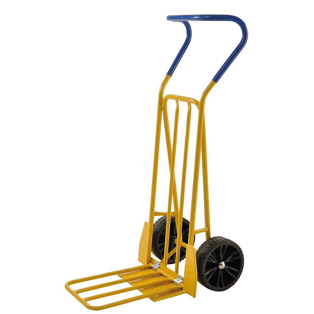 Stabile Sackkarre mit großem, ergonomischem Griffbügel, klappbarem Ladebügel und 2 Hartplastik-Bockrollen.