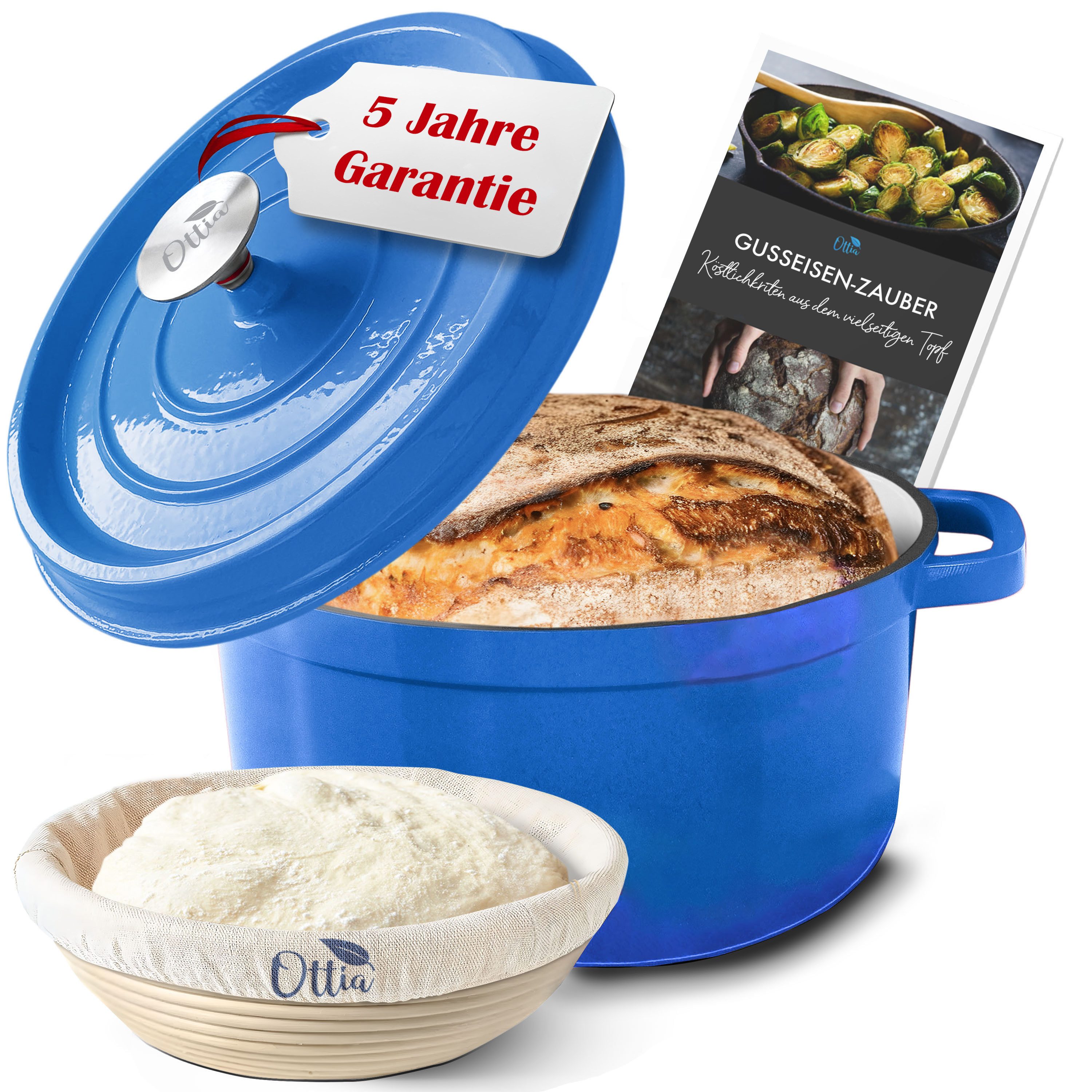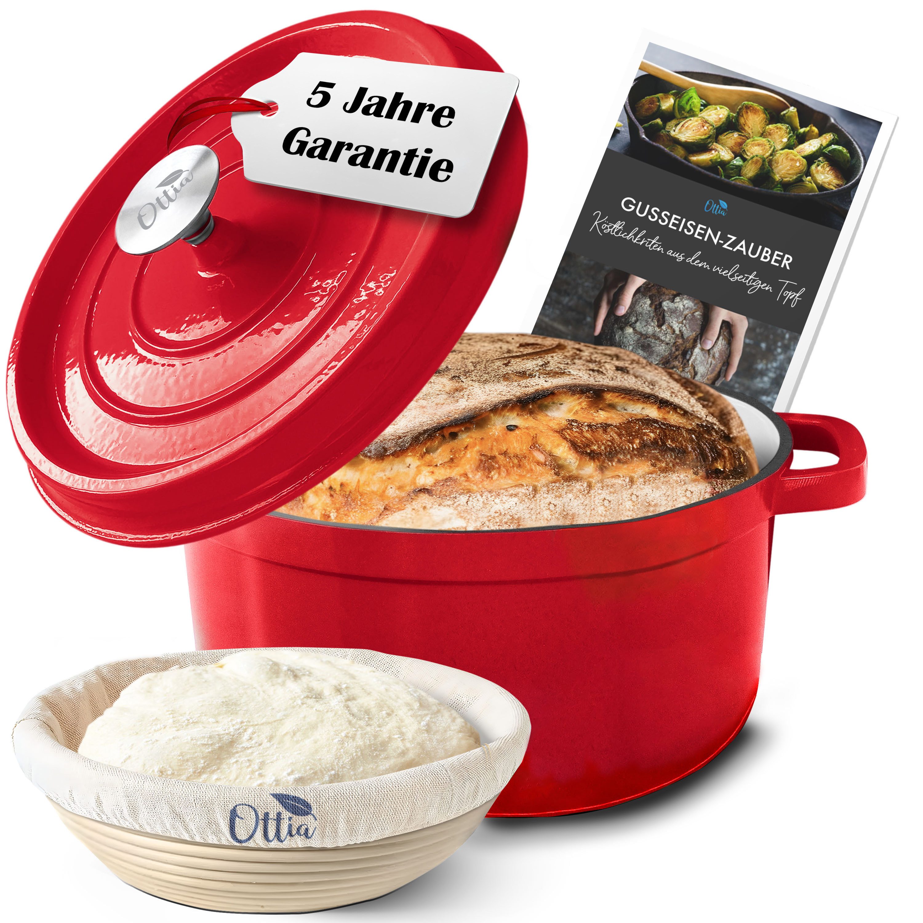 Der Ottia ST26 ist die ideale Wahl für jeden, der zu Hause leidenschaftlich kocht, sowie für Profis. Zahlreiche Menschen aus der Gastronomie und bekannte Content Creator setzen auf diesen Topf. Das besonders reine Gusseisen zeichnet sich durch hervorragende Wärmespeichereigenschaften aus. An der Innenseite des Deckels befinden sich sogenannte Aroma Noppen. An diesen sammelt sich das Kondenswasser im Topf und gibt dieses wieder an das Gericht ab. Diese Technik wird bei Profiköchen "arrosieren" genannt und trägt dazu bei, das sich der Geschmack im Essen vertieft und gleichzeitig ein austrocknen verhindert wird (man kann auch im Schmortopf Essen zerkochen). Die dreilagige Emaille-Beschichtung verhindert das Anhaften und erleichtert die Reinigung enorm. Mit diesem Topf kannst Du im Ofen und auf allen Herdarten (Gas, Elektro, Induktion, Halogen, Keramik) bis zu 270° Celsius sicher kochen. Dank seines Volumens von 6 Litern hast Du genügend Platz, um Brot zu backen, Schmorgerichte für 4 bis 6 Personen zuzubereiten und vieles mehr. Das mitgelieferte Zubehör, der Gärkorb zum Brotbacken, lässt Dich sofort starten und beste Ergebnisse erzielen. Das umfangreiche eBook enthält viele tolle Rezepte, auch von Profis, die mit diesem Topf kochen; es wird stetig erweitert, und Updates sind kostenfrei verfügbar. Als Hamburger Unternehmen legen wir größten Wert auf hohe Qualität und maximale Kundenzufriedenheit. Wir stehen Dir bei allen Fragen und Anliegen mit Herz und Hand zur Seite.