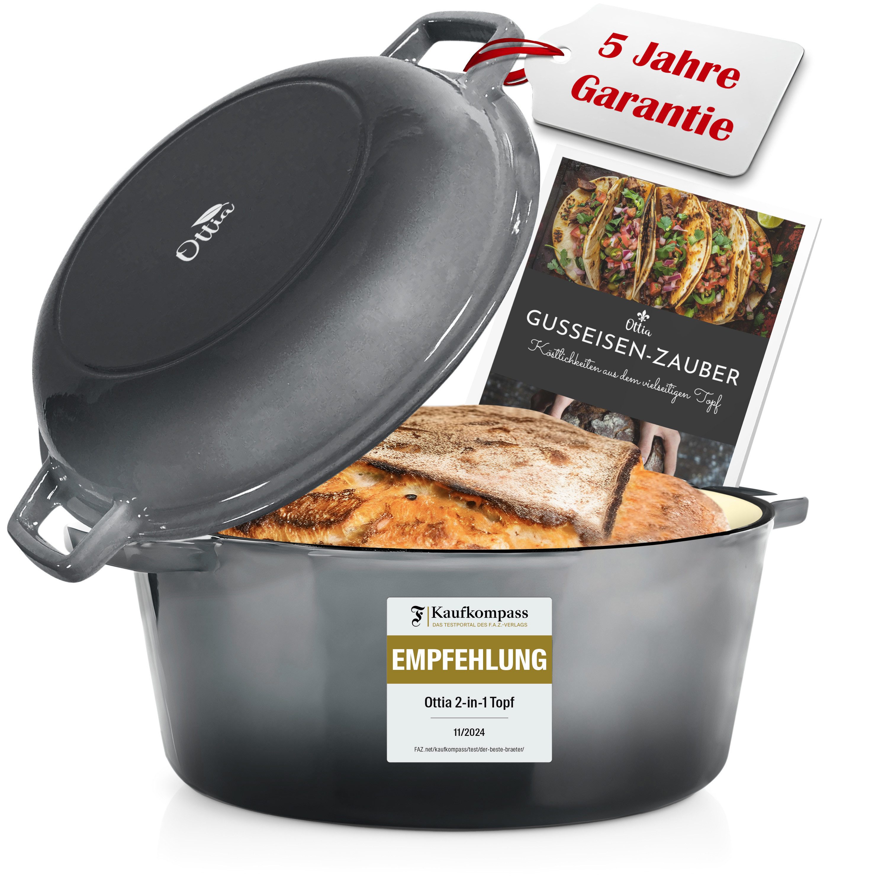 Der Ottia Gusseisen Topf mit 2-in-1 Funktion ist die ideale Wahl für jeden, der zu Hause leidenschaftlich kocht, sowie für Profis. Zahlreiche Menschen aus der Gastronomie und bekannte Content Creator setzen auf diesen Topf. Das besonders reine Gusseisen zeichnet sich durch hervorragende Wärmespeichereigenschaften aus. Die dreilagige Emaille-Beschichtung verhindert das Anhaften und erleichtert die Reinigung enorm. Mit diesem Topf kannst Du im Ofen und auf allen Herdarten (Gas, Elektro, Induktion, Halogen, Keramik) bis zu 270° Celsius sicher kochen/backen.