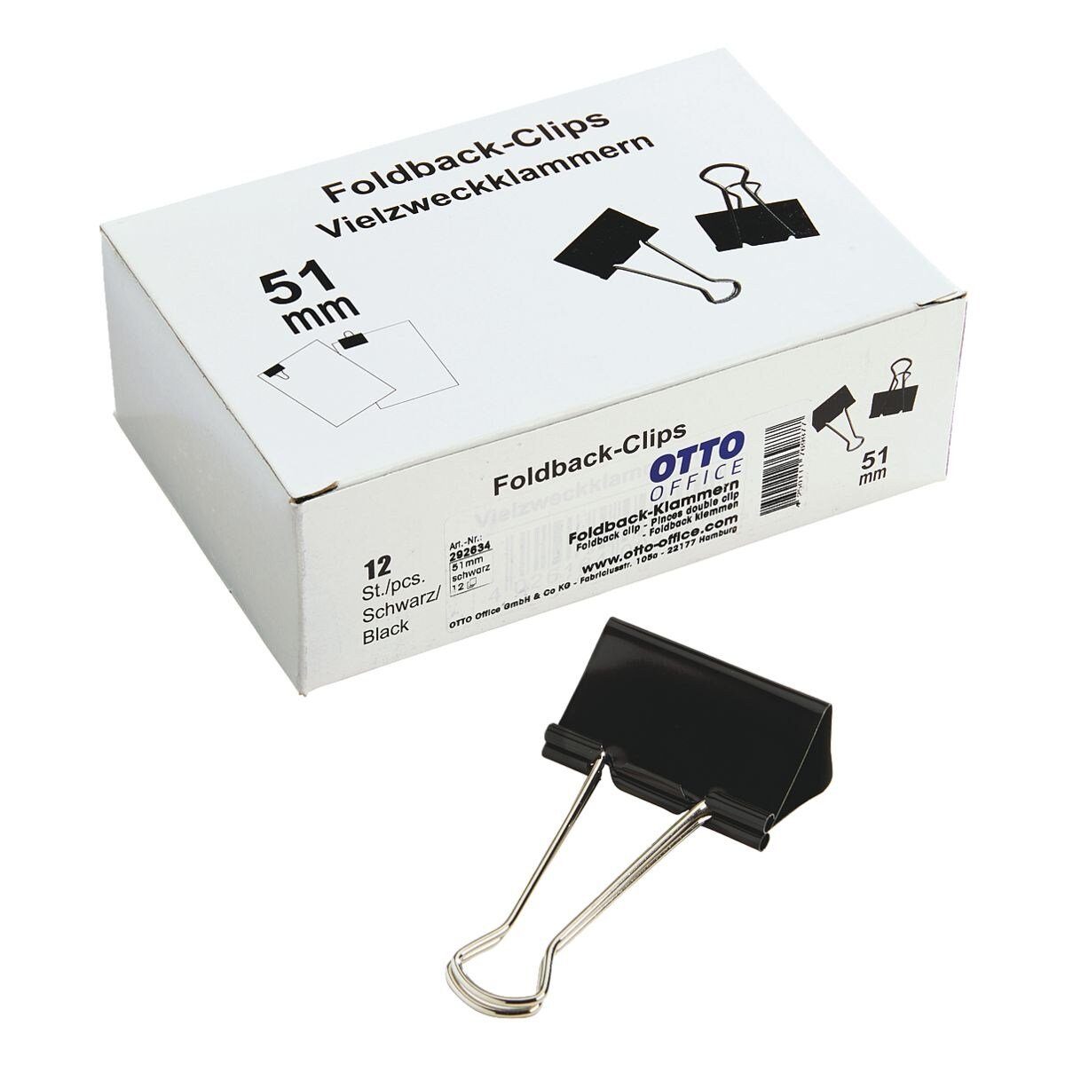 Foldback-Klammern 51 mm, schwarz, Klemmstärke: ca. 20 mm, Ausführung: 51 mm, für Blätter, Beutel, Papierstapel etc., Farbe: schwarz, Inhalt pro Pack: 12 Stück