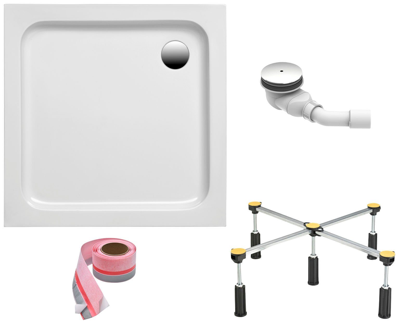 Mit dem Set Quadratische Duschwanne von Ottofond erhalten Sie eine Duschwannein einem klaren Design aus hochwertigem, volldurchgefärbtem gegossenenem Sanitäracryl in der Размер 80x80x6 cm (L/B/H) und der Farbe weiß. Der Außenmantel ist glasfaserverstärkt, im Wannenrand und im Bodenbereich sind Versteifungen einlaminiert, die eine stabile Formgebung garantieren. Durch die glatte und porenfreie Oberfläche bietet die Acrylduschwanne einen guten Schutz vor Schmutz und Ablagerungen. Das Duschwannenfußgestell eignet sich besonders gut zum Ausgleich geringer Unebenheiten im Untergrund. Eine einfache und schnelle Montage der Duschwanne ist mit diesem System garantiert. Die Füße sind höhenverstellbar von 11-16 cm. Mit der "Tasso 90" erhalten Sie die passende Ablaufgarnitur aus hochwertigem Kunststoff mit verchromten Ablaufdeckel mit permanentem Ablauf und Haarfangsieb. Das Abgangsrohr hat einen 40 mm und einen 50 mm Anschluss und kann problemlos mit HT-Rohren verlängert werden. Das Wannenfugenband eignet sich für alle gängigen Bade- oder Duschwannen aus Metall, Acryl oder Keramik und sorgt für die dauerhafte Abdichtung. Das Band wird im Zuge der Montagearbeiten an der Wanne befestigt und im zweiten Schritt vom Fliesenleger überfliest. Somit ergibt sich ein sicherer und unsichtbarer Schutz gegen Schimmel und Feuchtigkeit. Das Duschwannenset von Ottofond bietet ein perfektes Duscherlebnis.